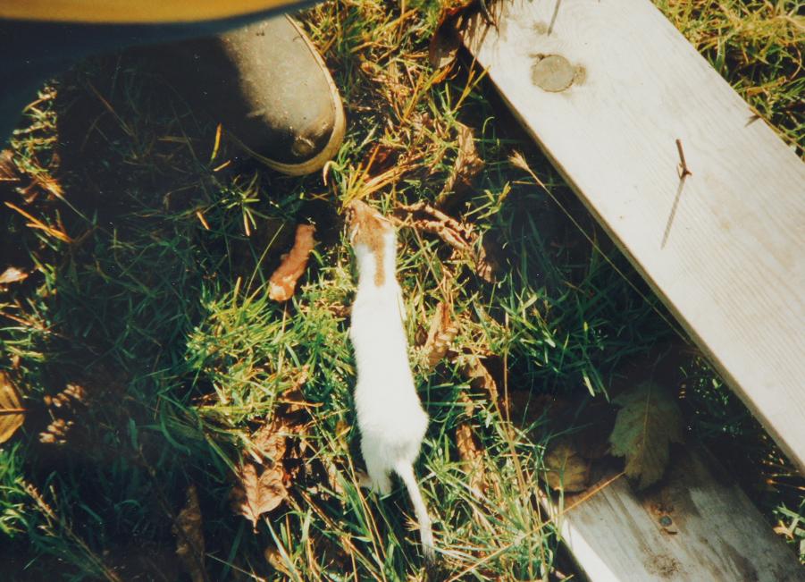 This is a pair of Least Weasels (Or Ermine in the winter when they turn white). They hung out around the house for a few weeks one spring/summer, and were quite fearless towards humans and pets (the dog tried to chase them, but the cat ignored them). They would come up to people and take food from your hand, and occasionally got inside the house despite our attempts to keep them out (they fit through tiny holes and crevices. One night we were eating dinner and heard two thumps, the weasels had squeezed through a crack above a shelf and fallen out on the floor). Eventually they must have moved on to hassle someone else, but we occasionally got their relatives showing up in the entry mudroom sniffing after dogfood or bones.
