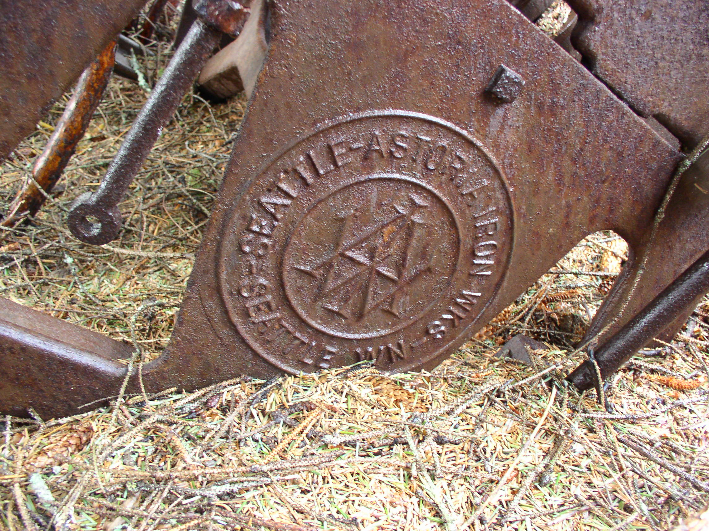 Update: after looking closely at my photos, I can make out what appears to be “Vulcan Iron Works” of Seattle. Here are some photos of a very similar Vulcan steam donkey, built in 1901.