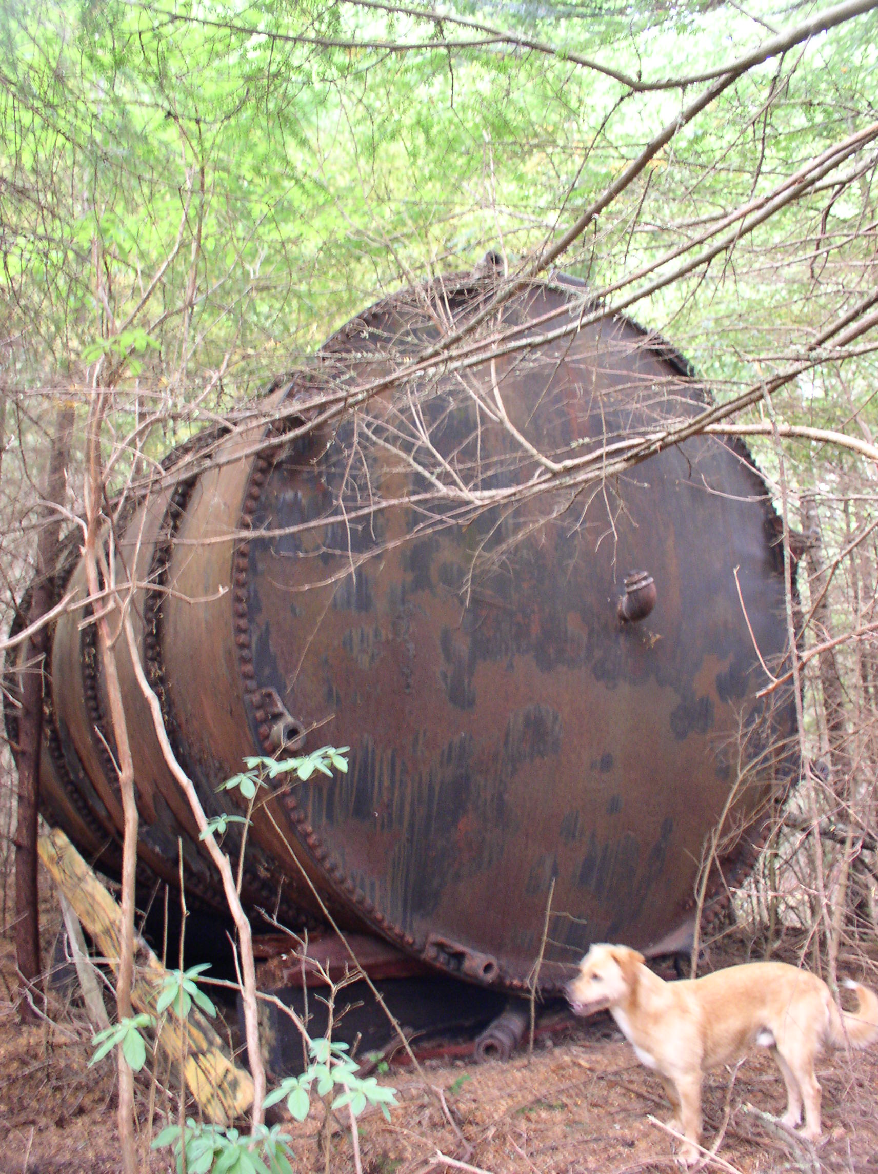Two large tanks such as this held water for the boiler. On the map above, you can see the tanks located behind the power house. Update: The tank below is in fact the one located behind the pump house on the above map, and was used for oil. The two tanks behind the power house were nearly identical in design.