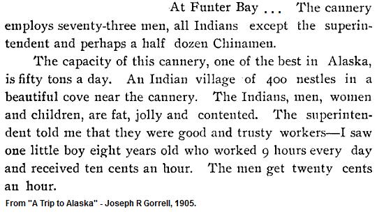 While opium and rice wine are often associated with Chinese cannery crews, the workers were not always of one nationality. Canneries employed local Tlingit natives in various positions (in fact, native employees dominated this cannery in the early years). Canneries later brought in Asian laborers from the lower 48 (Chinese, Japanese, and sometimes Korean immigrants). By the 1930s, Filipino and sometimes Mexican employees were more prevalent, along with some Puerto Rican and South American immigrants, often with Chinese managers or labor bosses. The casual racism of the period is obvious from reading contemporary documents and wage scales, white (European) employees received the highest pay and were usually in management positions, Asian laborers received less, and Tlingit workers were paid the least.