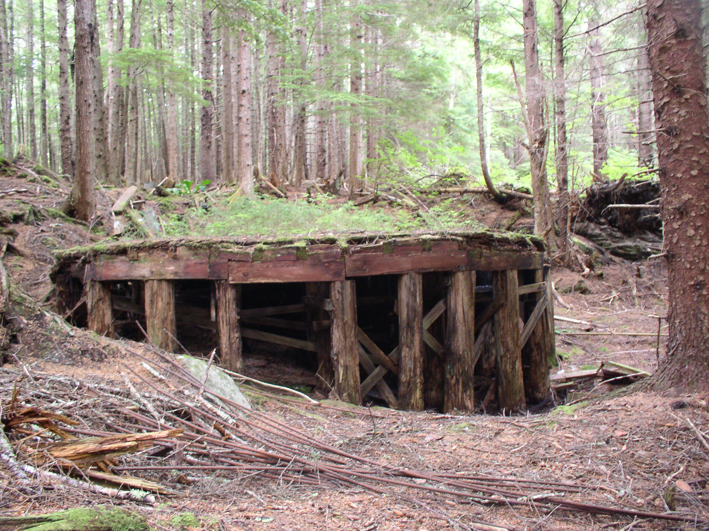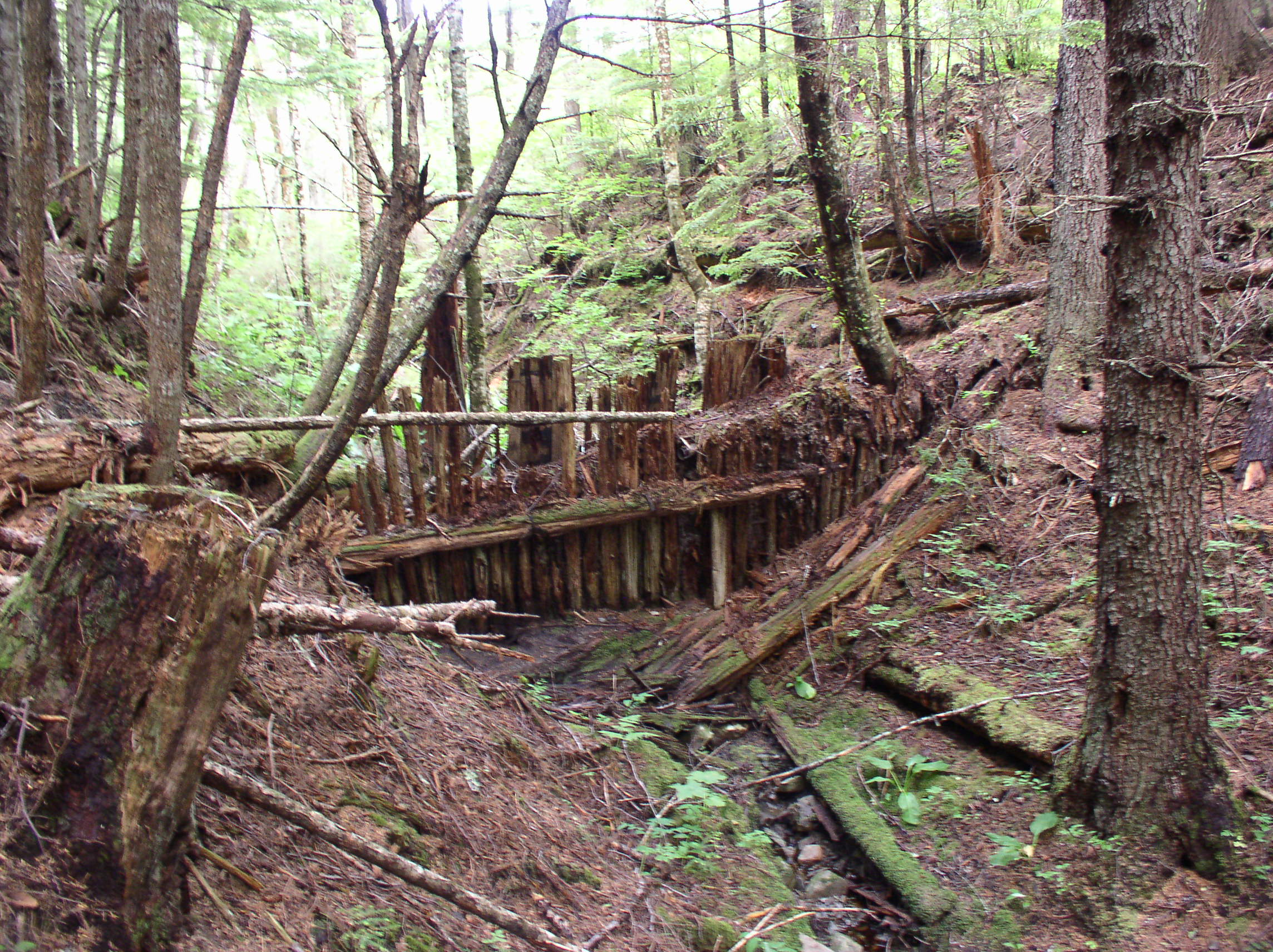 The cannery was not located directly on a stream, so the tanks were supplied by a network of ditches, small dams, and pipes. Below is an example of a simple wood stave dam near the cannery, made from locally-cut timber: