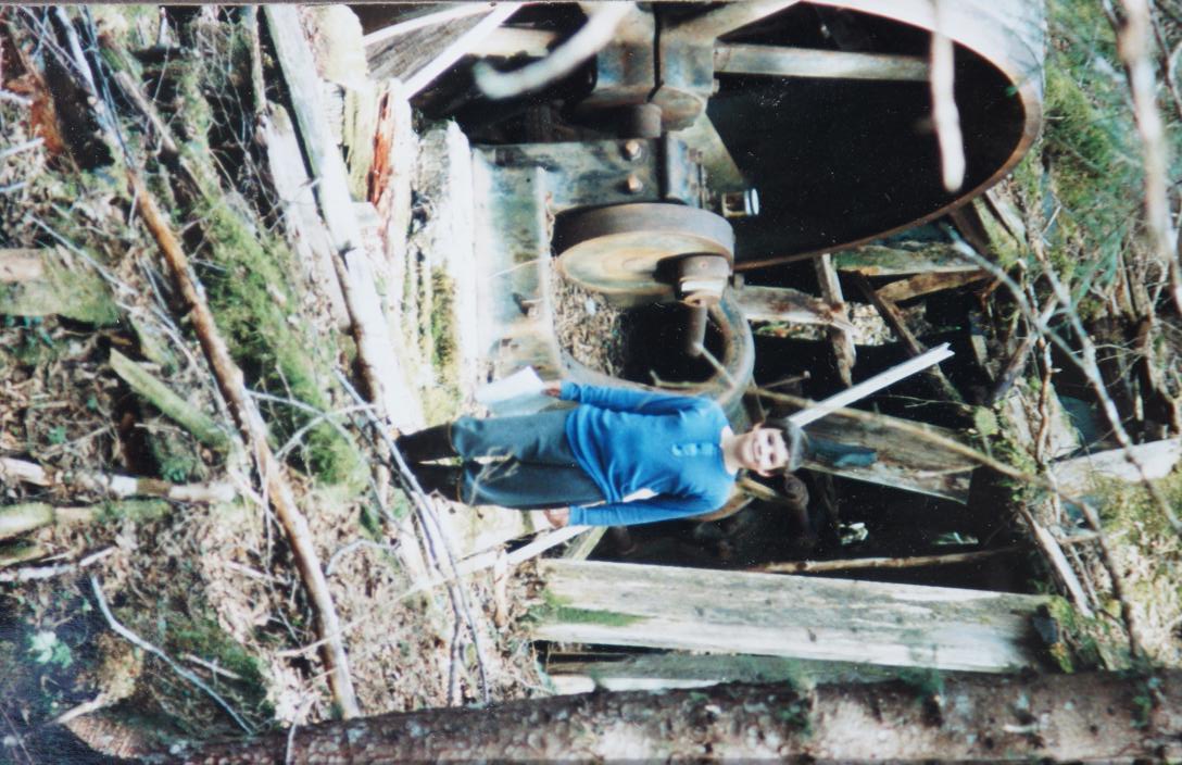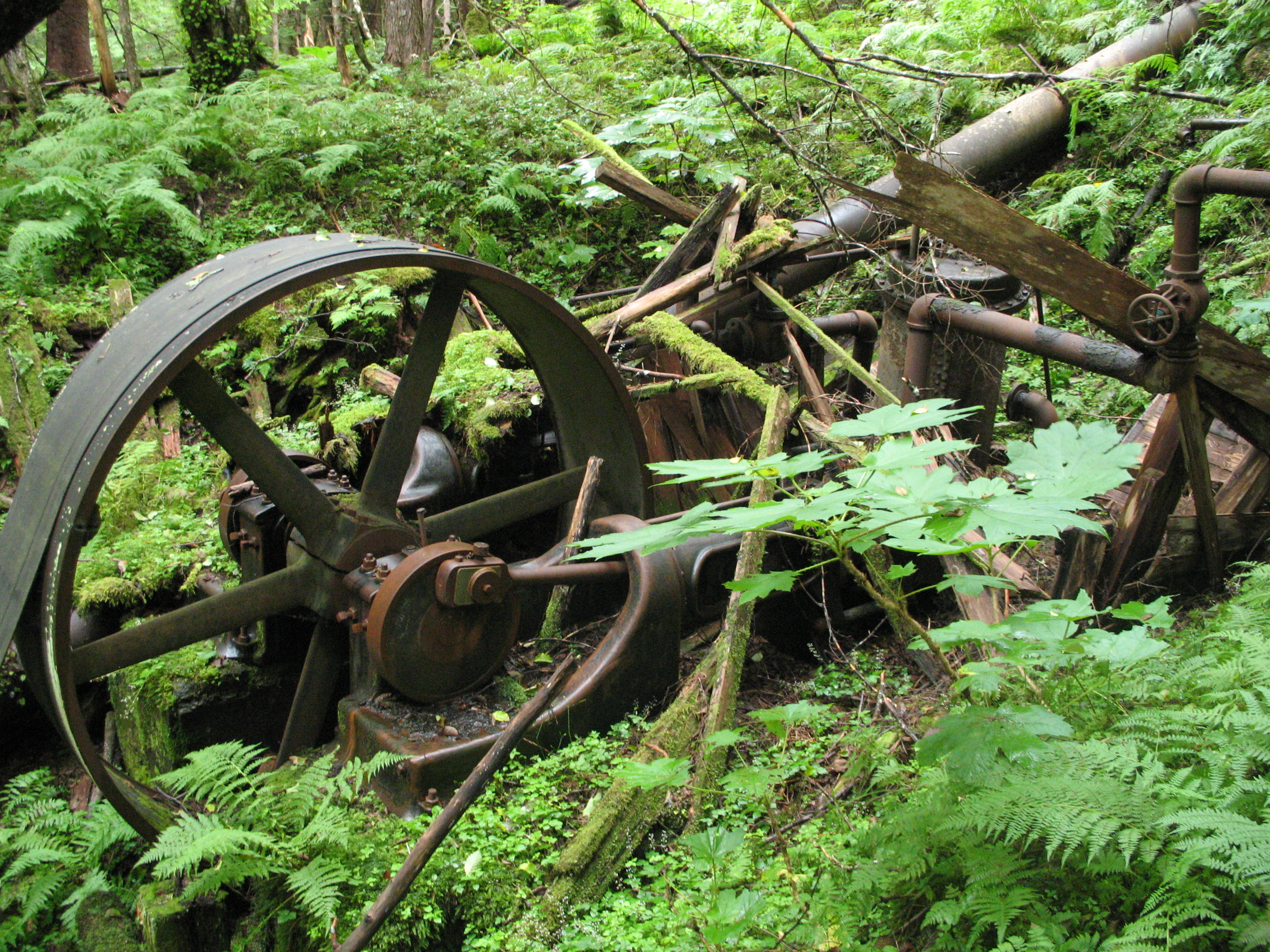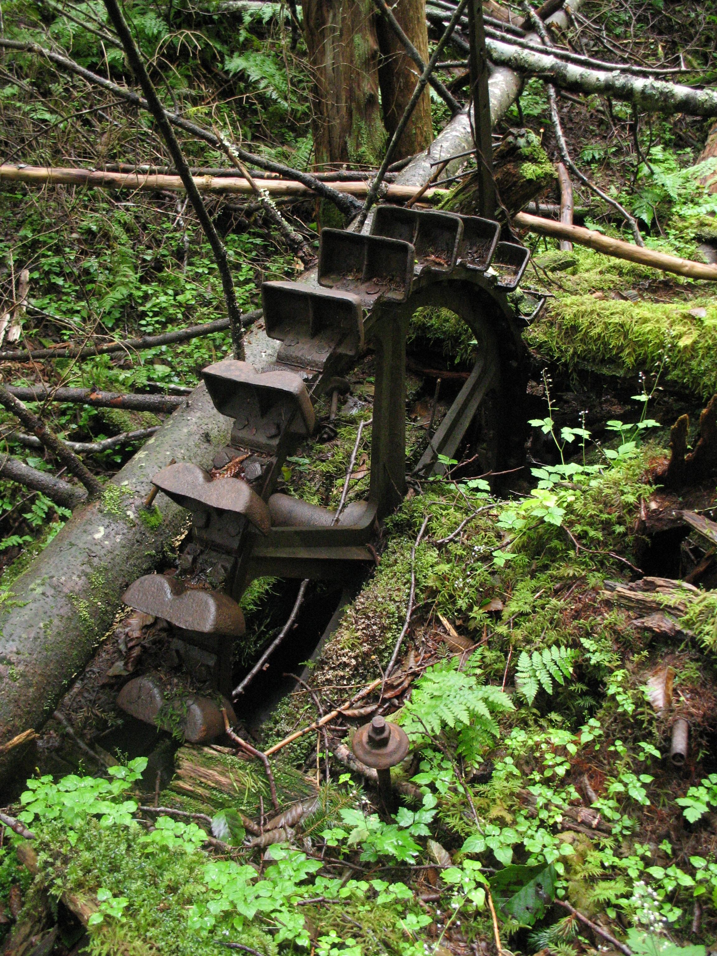 In addition to supplying boilers, canning systems, kitchens, baths, etc, water was also used directly to generate power in several places. At the base of Mount Robert Barron is a large Pelton wheel, driving an air compressor and electric generator to charge battery-powered mine locomotives. Water was collected in ditches from a bench partway up the mountain, and funneled into a pipeline dropping steeply down the side.