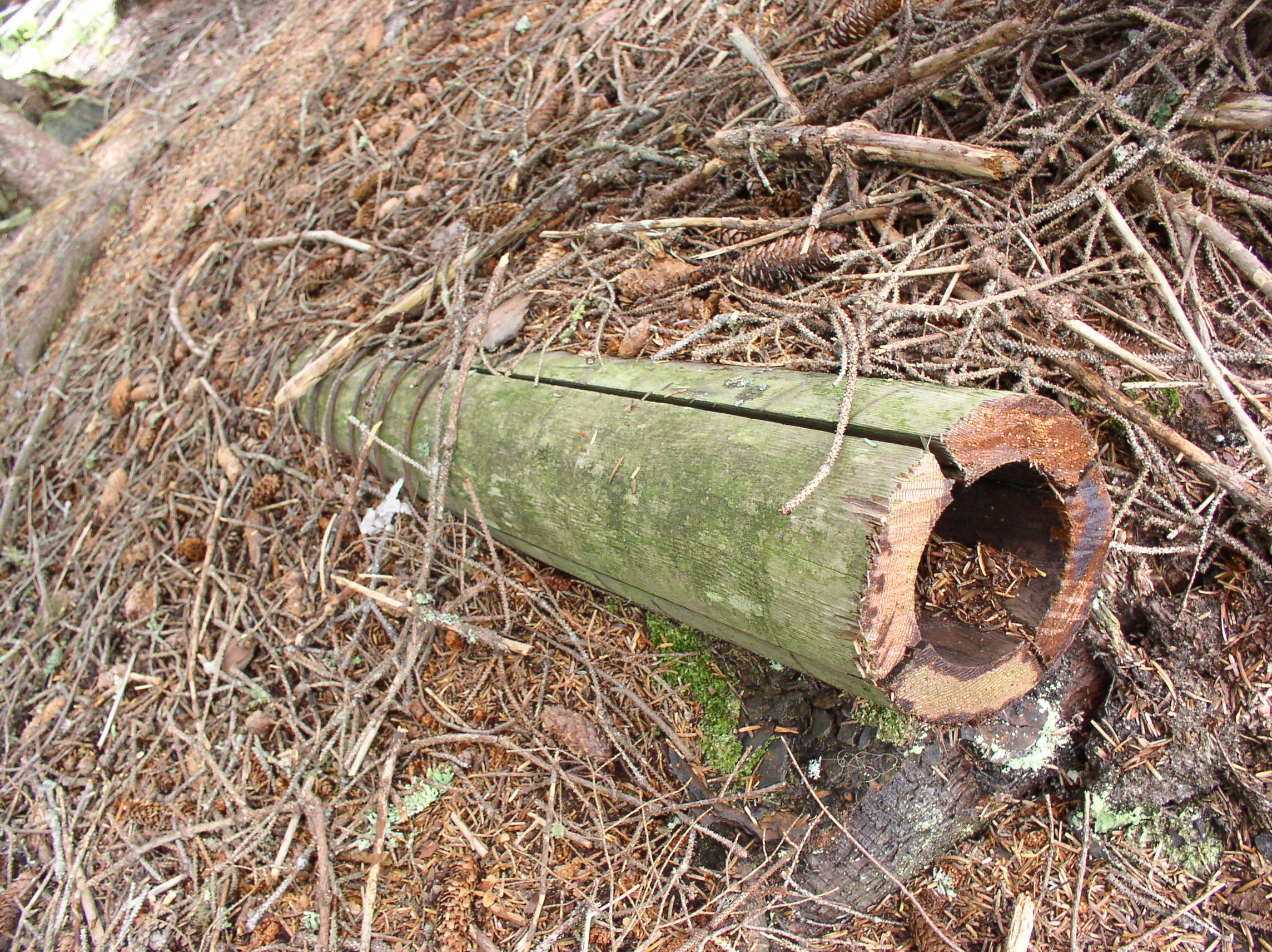 Several cannery pipelines were made from redwood staves. Redwood is a naturally rot-resistant timber that was cheaper and held up much better than steel in the rainforest (you can still find salvaged redwood pipes in use for gutters and drains around the bay!). One of these pipelines ran for over a mile, reaching Nimrod Creek near a muskeg known as Pipeline Meadow. The pipes were constructed of four redwood pieces slotted together, and banded with steel wire to hold them together. You can find these pipes all through the woods, in many cases the steel banding has rusted away, but the pipes are still watertight! Apparently this type of pipe is still made, and in all sizes. Until I started researching it, I had assumed it was a historical curiosity.