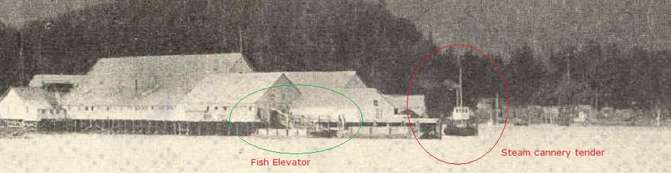 Cannery pier in 1907 showing tender tied up about where the engine is now, and the fish elevator with scows docked next to it.