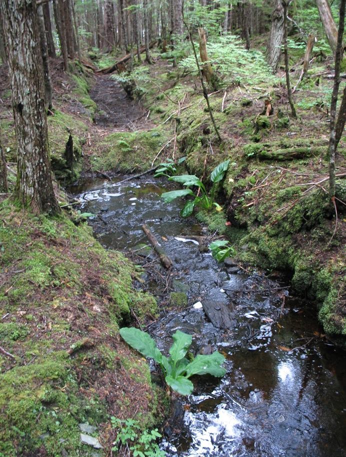 An abandoned ditch at Funter Bay, the water has found or made an easier path to the left, with the dry section beyond slowly filling in with organic debris: