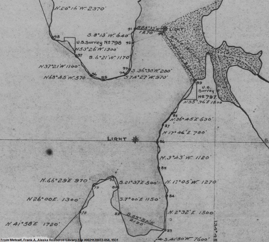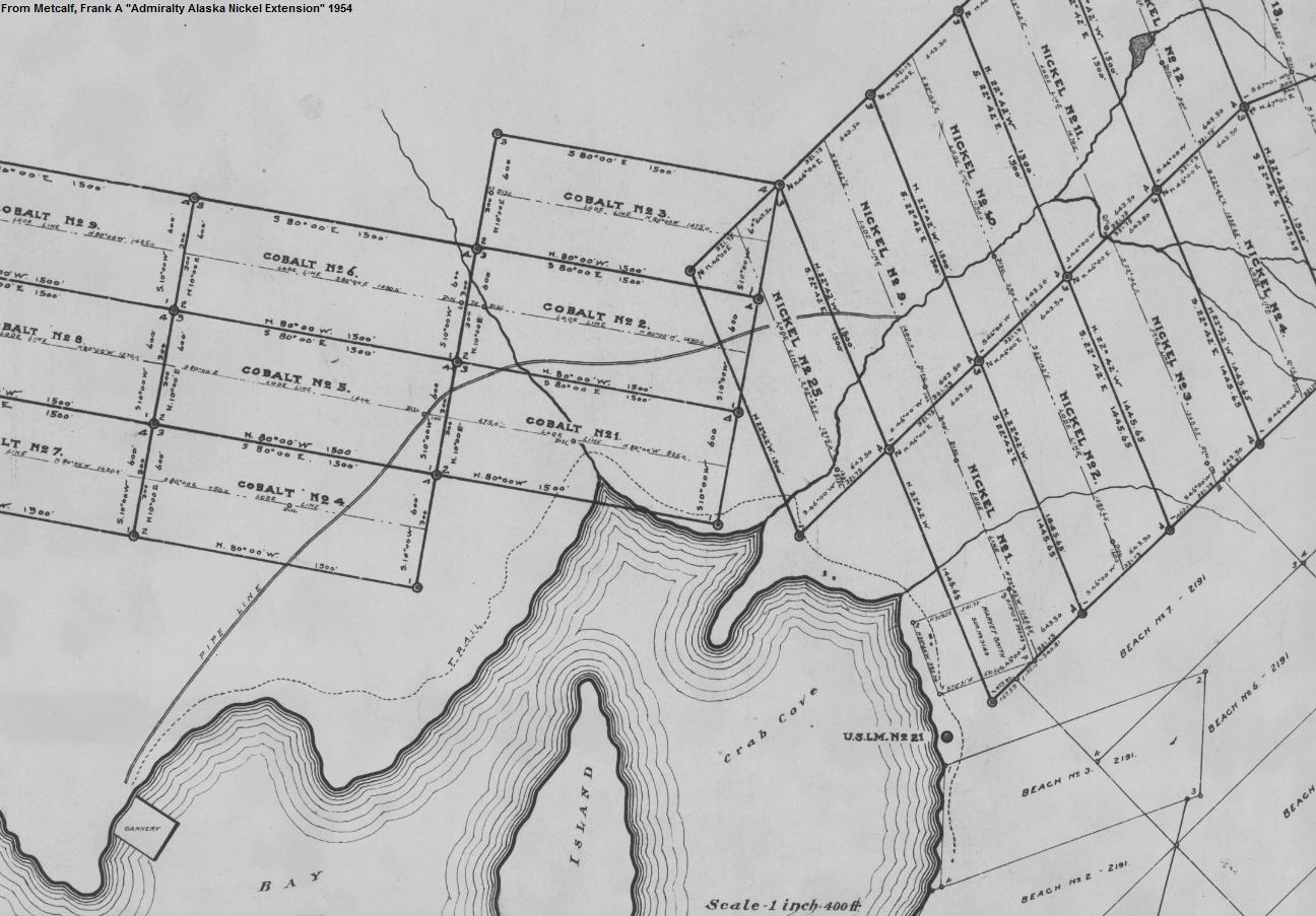 After previously writing about local water use for industry and power generation at Funter Bay, I came across a few more maps of such projects. The first, below, shows the pipeline from the Thlinket Packing Co cannery to “Nimrod Creek”, near “Pipeline Meadow” (local names). This creek is one of the larger and more reliable water sources convenient to the cannery. The grid lines on the map are old mining claims which have since lapsed. The small pond at the upper right is from a long-existing beaver dam which can still be found today.