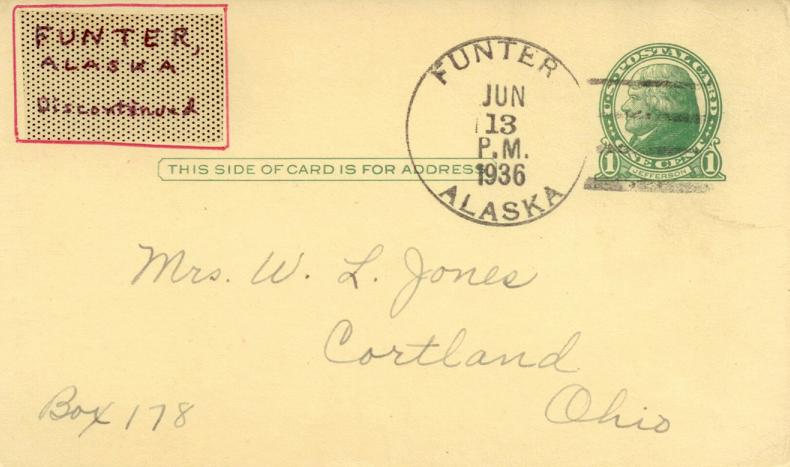 Mail at Funter was general delivery, recipients had to visit the post office to pick up their mail. Addresses consisted of the recipient’s name with “Funter, Alaska” or “Funter Bay” underneath, zip codes were not used until the 1960s. Much of rural Alaska shared the 5-digit 99850, Funter Bay’s full zip code was 99850-0140. The USPS serial number for the Funter post office was 05544.