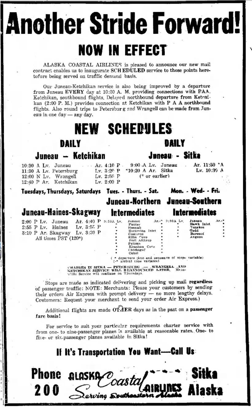 Air mail began appearing around the 1930s, with the government experimenting with different air carriers and contracts for rural service. A 1947 advertisement for Alaska Coastal Airlines notes that “Air Express” service was available to and from Funter and other small communities by request on a variable schedule.