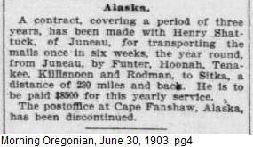 An article in the January 1903 Daily Alaska Dispatch noted that Funter Bay had a post office, but did not yet have a contract for mail delivery. In March of 1903 the assistant postmaster general for Alaska reportedly was considering “the establishment of better mail facilities for Funter post-office” (Daily Record-Miner). By June there was an initial contract with Henry Shattuck to deliver mail every 6 weeks. Shattuck reportedly arranged to buy the steamer Prosper from the Alaska Steamship Co in July of 1903, then formed the Juneau Steamship Co in August and decided to buy the Georgia instead. He is better known for his real estate and insurance ventures, but maintained ownership in various mail boats for some time as well.