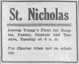 A 1912 Dispatch article discussed the mail service to outlying communities, including Funter Bay. Mail from outside was received in Juneau on steamships, then sorted and distributed to mail boats serving the surrounding area. The Juneau postal staff complained of the burden of meeting late or irregular boats.