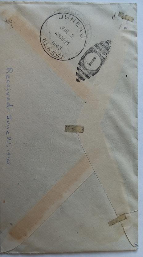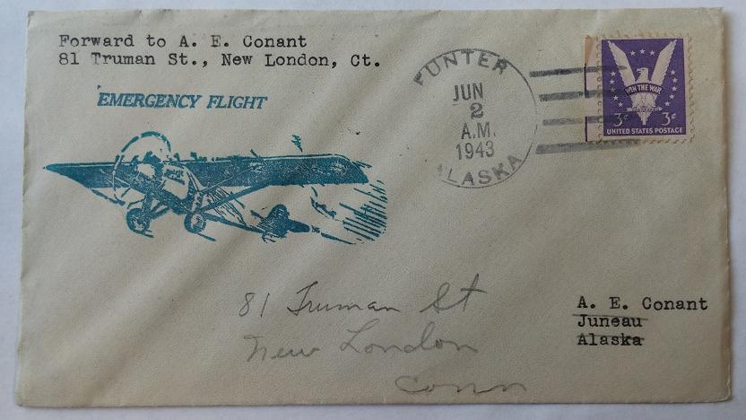 Below is a WWII-era postal cover with Funter postmark. The “Emergency Flight” stamp appears to be a reference to Emergency Air Mail, a federal law allowing air mail at ground postage rates for communities cut off from normal surface mail. This was intended for communities affected by floods or other problems, but became popular in rural Alaska. It seems to have been common to mail these to the nearest major post office (in this case, Juneau), then have a forward or return address for the final intended address.