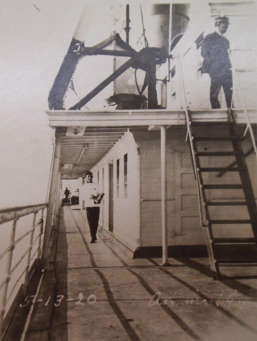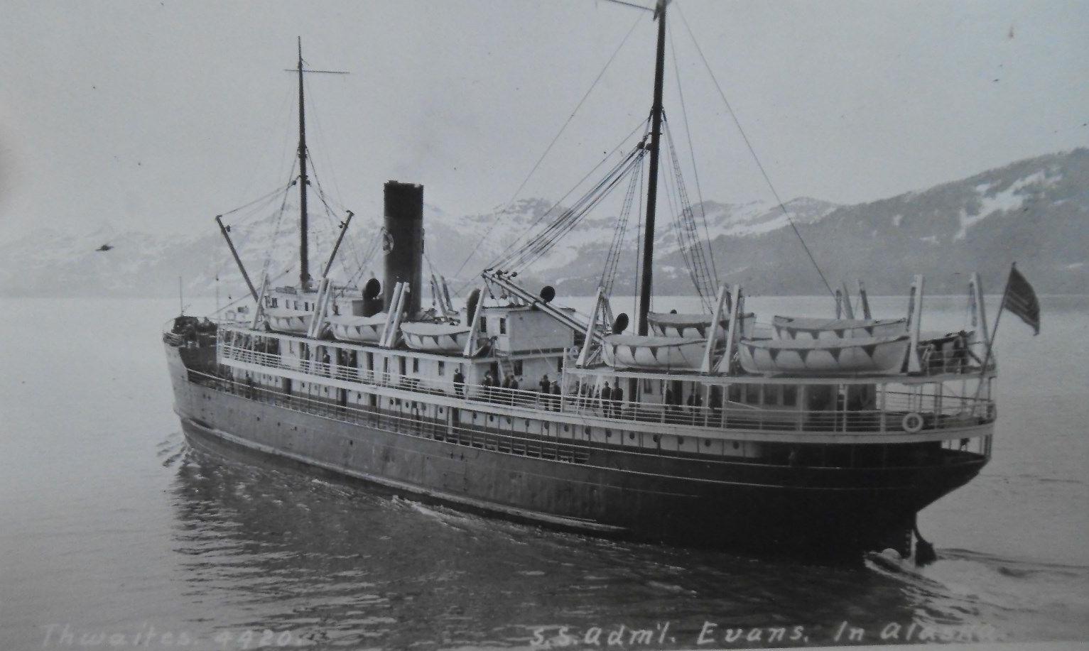 The next two images show the Steamship Admiral Evans, which occasionally called at Funter Bay. The first appears to be a commercial postcard, possibly purchased on board. The 2nd seems to be labeled in the same way as some of the cannery tender photos from this collection. This may have been taken on the way to Funter Bay at the start of the 1920 season.