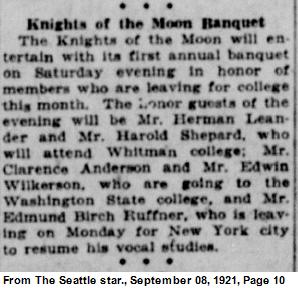 Many of the Ballard students seen here went on to form a club called the “Knights of the Moon”, established January 31, 1920 (Per the Seattle Times). As described in a 1994 Times article, the club was started by 13 friends who attended Ballard High School in 1917, 1918, and 1919. Most of the club members were school athletes who played basketball and baseball, and the club fielded Church League and City League teams after high school.  Several members were good singers, who would go to “Ballard Beach” in Seattle to “bay at the moon” according to Clarence Anderson (George Anderson’s brother). The club would put on dances, beach parties, and theater parties. Anderson reported that there was no drinking at these parties, and credits the club for keeping some young people out of trouble.