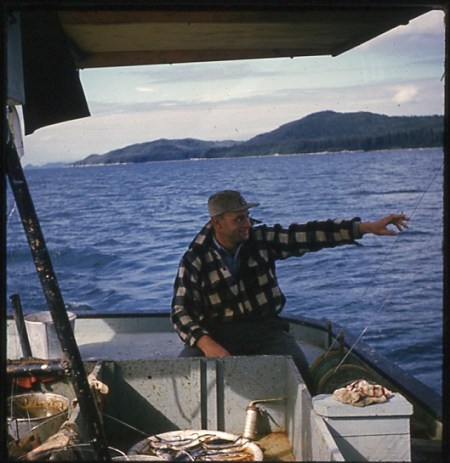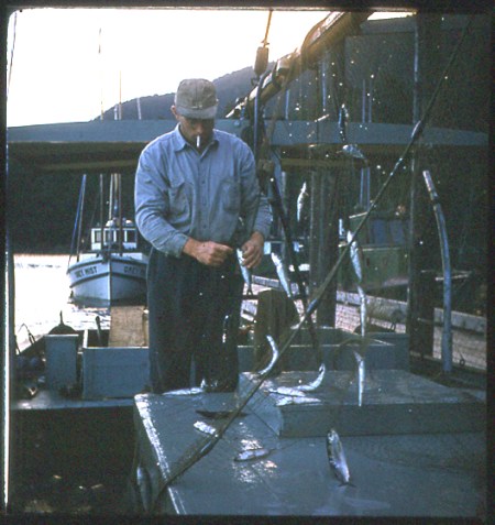 Below we see Carl Jensen cleaning fish near the entrance of Funter Bay. A skein of salmon eggs is in his hand. The cannery and some other trollers are barely visible in the background: