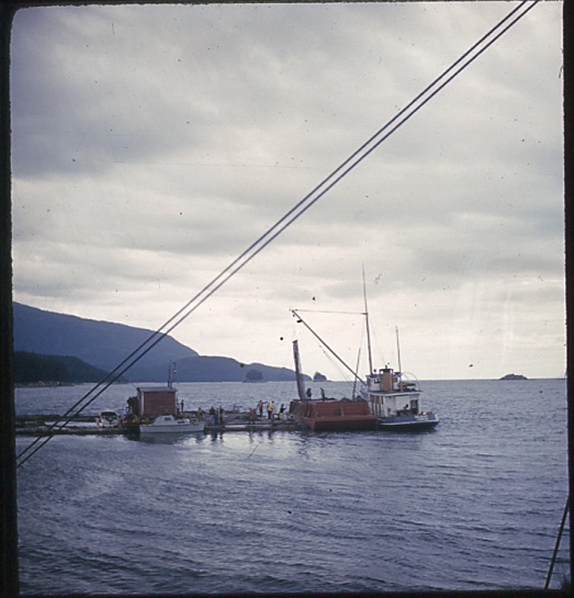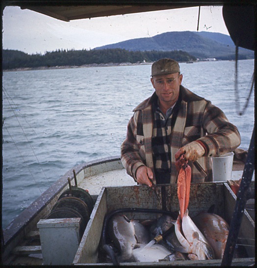 Below we see Carl Jensen cleaning fish near the entrance of Funter Bay. A skein of salmon eggs is in his hand. The cannery and some other trollers are barely visible in the background: