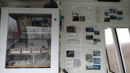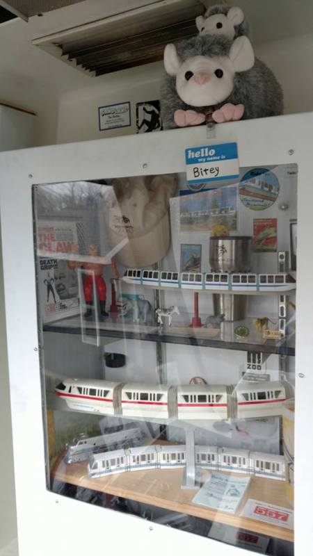 I’ve added some “artifacts” to my miniature monorail museum, located in the head car of the former MN Zoo Monorail that I bought a couple years ago.