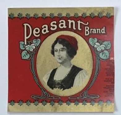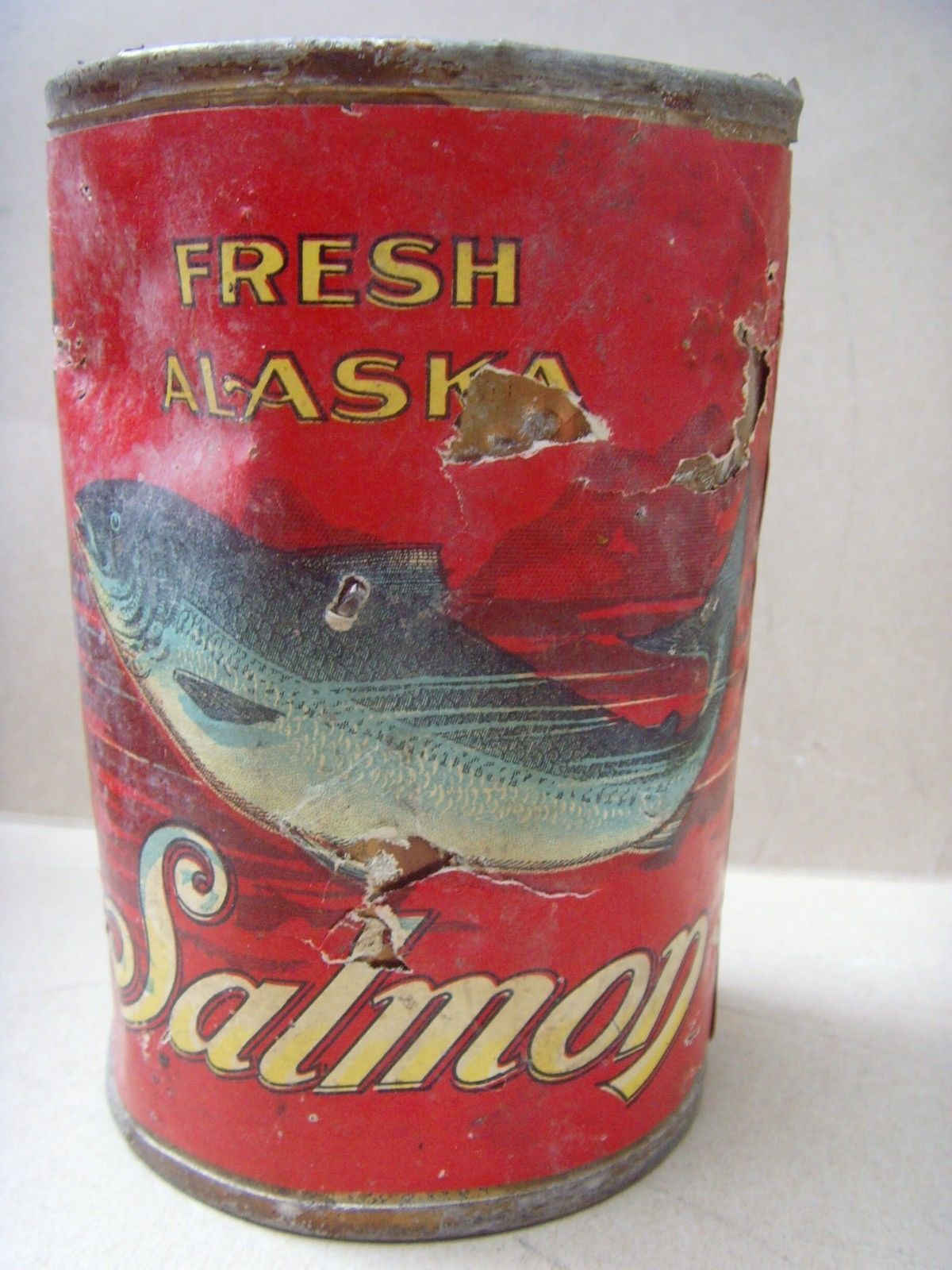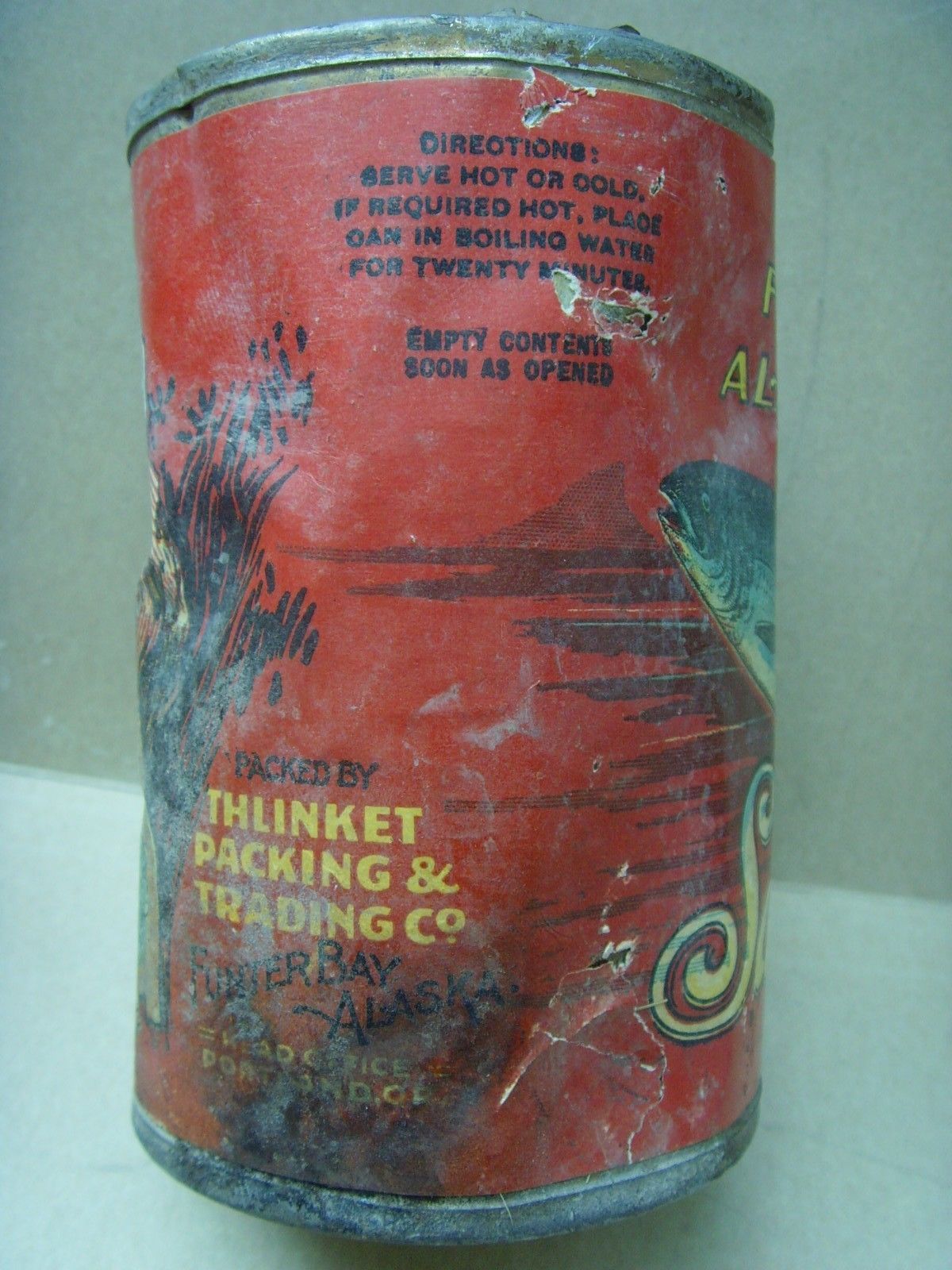 An early “Peasant” brand can for Pink Salmon. This artwork matches the 1906 trademark filed by the Thlinket Packing Co.