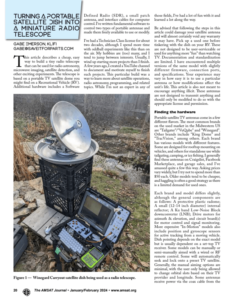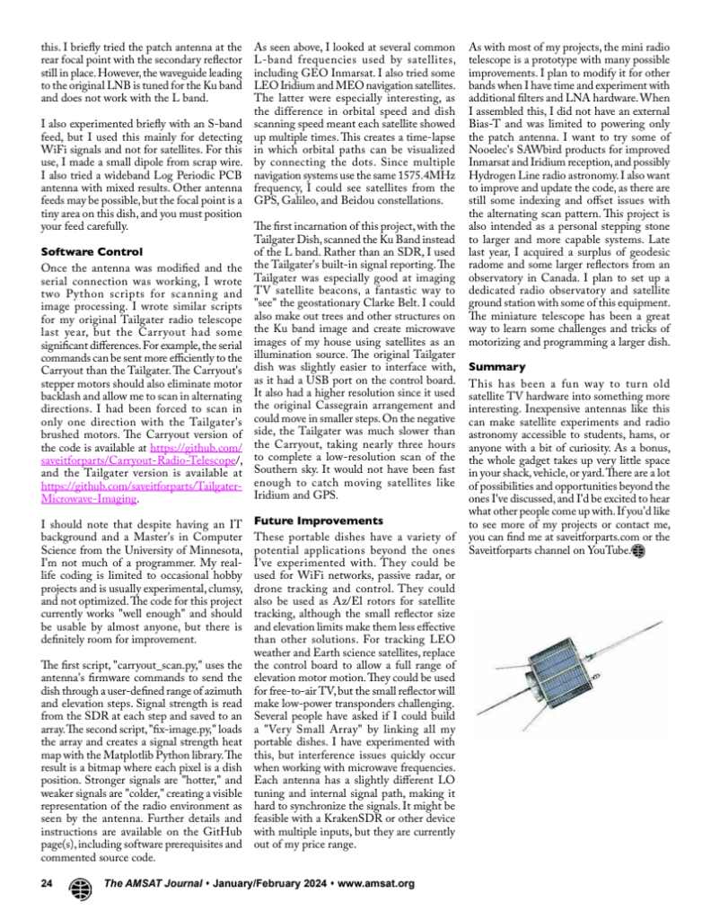 A few weeks ago I was invited to write an article for the AMSAT Journal, an online magazine of amateur satellite communications. The article is now out, in the January/February issue! You can see my article below, or you can subscribe to the journal to read all the articles in this issue and back issues! It’s a fascinating magazine, and I just subscribed myself!