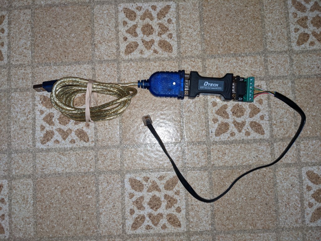 I had initially showed this on my Youtube channel, and then shoved it onto the ever-growing “to-do” pile. A viewer commented that they could get a serial console with some cable adapter trickery. A USB-to-RS232 cable goes to a Dtech RS232-RS485 adapter, then to a custom RJ-25 cable (6-conductor phone cord). It looks like this: