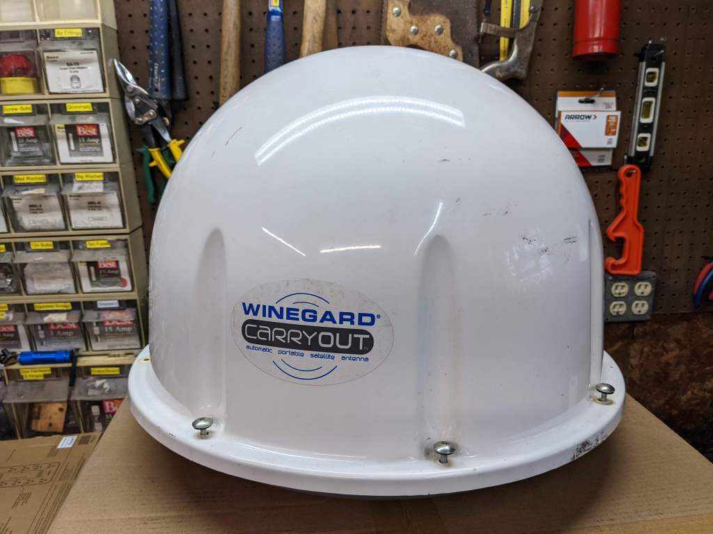 I’ve previously modified a small portable satellite dish into a radio telescope. Since I keep finding these little dishes on the used market, I figured I’d try it with another brand. This particular dish is a “Winegard Carryout”.