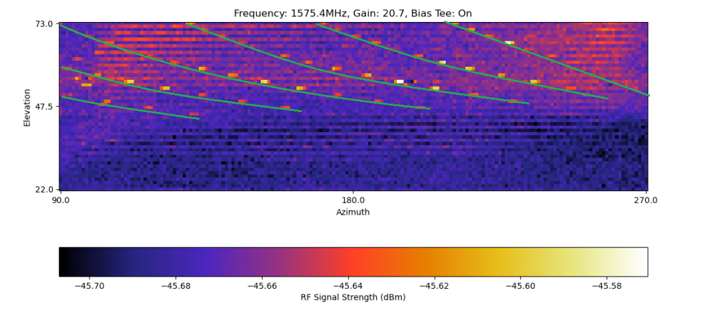 After about two weeks of struggling with the code, feed, motor indexing, and other issues, I finally got a couple images of various L-band satellites. This is what the satellites look like in radio frequencies as they pass over my location.