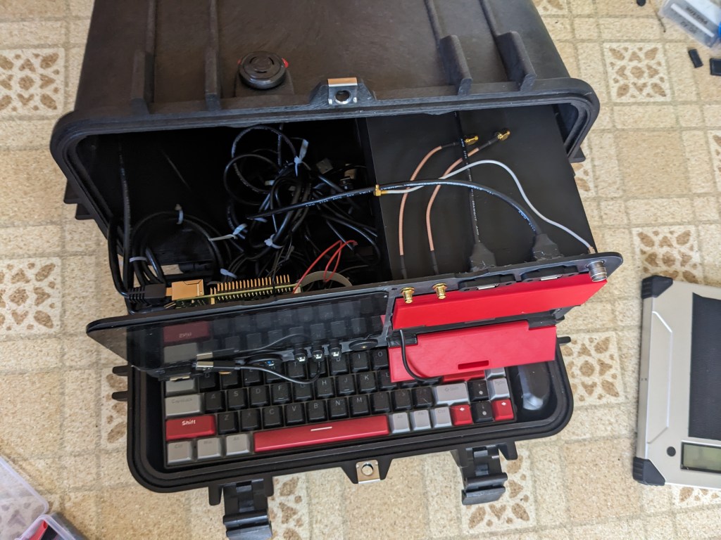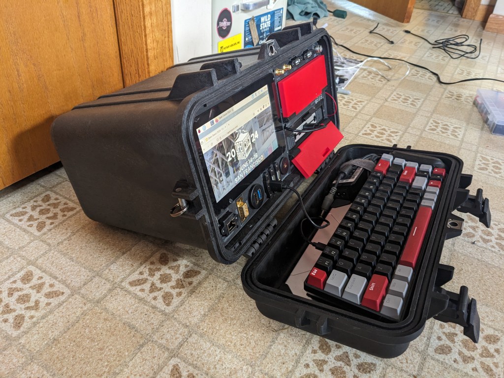 This version uses a Pelican 1340 case, slightly modified to remove some internal lumps and protrusions. The brain is a Raspberry Pi 4 with 7″ screen. I laser-cut a custom front panel and 3D-printed the “Drive Bays” (files available here: https://www.thingiverse.com/thing:6672979)
