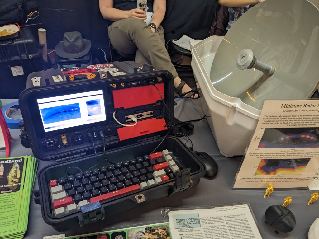 This cyberdeck is great not only for my satellite experiments on the go, it was also a fantastic part of my exhibit booth at Open Sauce 2024, a Youtube/maker/science convention in San Francisco. I used the deck to run one of my hacked satellite antennas for microwave imaging. It was a real attention-grabber at the booth and I think more people may have stopped to look at the deck vs the dish!