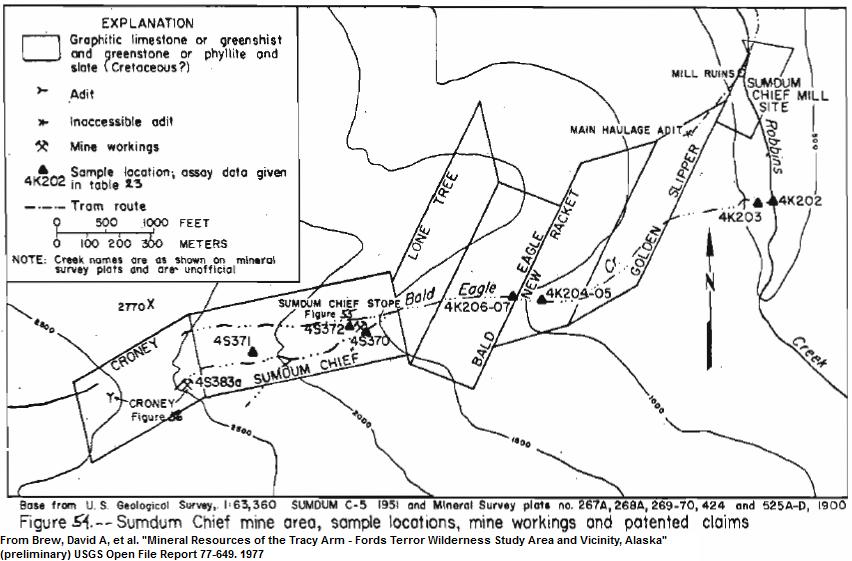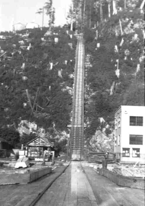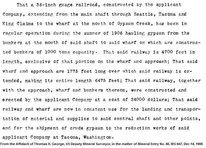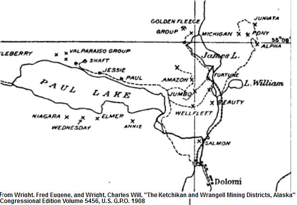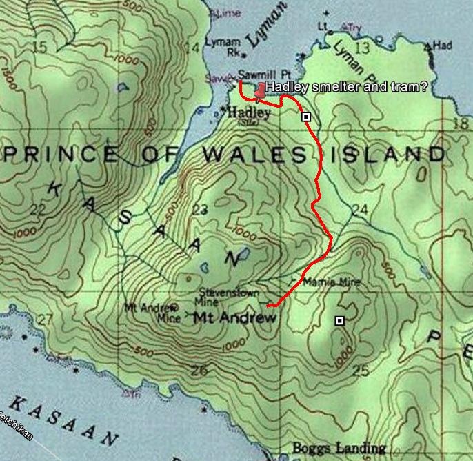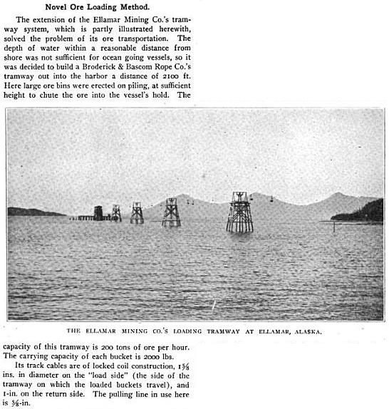 These are “borderline” tramways that was actually in British Columbia, but less than a mile from the Alaska border. The Granby Mining Co operated a limestone quarry at Swamp Point, on Portland Canal, across the mountain from their large Anyox operation. They also ran a mine and another quarry at Maple Bay. The Swamp Point quarry had about 1/2 mile of track and used a 24″ gauge gasoline locomotive. A photo of the rail dock can be found here.