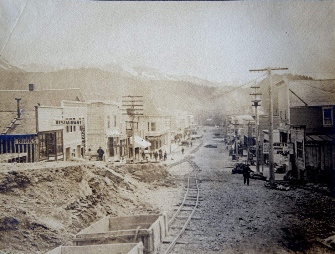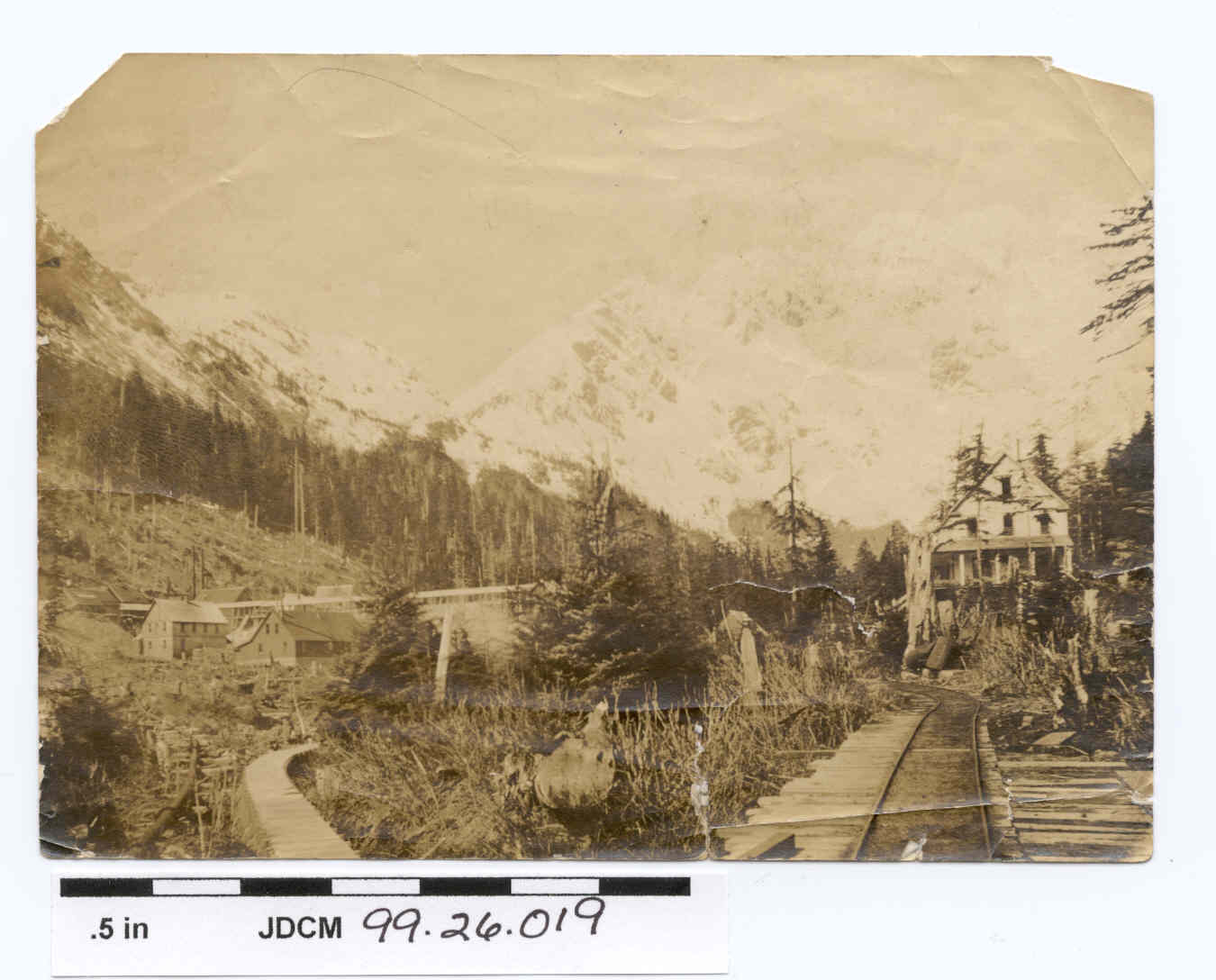 A photo provided by Carolyn and Michael Nore shows narrow-gauge rails down the main street of Girdwood, Alaska. Founded around 1907 as a mining town, and given a boost in 1915 by Alaska Railroad construction, the town was originally on the Southwest side of the mainline tracks near the shore. After the 1964 earthquake, the original townsite dropped below high tide level and was abandoned. The photos appears to be earlier than 1920, as a photo from that year does not show the tramway. It is unclear how far the narrow gauge tracks ran, or what rolling stock was used. They could have merely run to the beach, similar to the tramway at nearby Hope, or they could have run farther up the valley to mining sites.