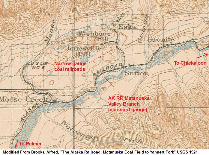 Do we really know that the Matanuska Valley coal-mine access branches were originally narrow gauge? They were standard gauge by 1950. Alaska RR operating timetable of June 3, 1951 shows the 3.8 mile Moose Creek branch, the 2.9 mile Jonesville Branch and the 0.5 mile (from Eska Jct.) Eska branch, with no indication of a gauge change, and second-class (mixed) train 22 from Anchorage went through to Jonesville, returning as train 21. My father (who was then Deputy Transportation Officer, US Armt Alaska) and I rode Anchorage-Jonesville in 1950; the passenger cars (probably just a combine) were left at Sutton, so we found footholds on one of the coal cars … easy enough going uphill, but lots of coal dust blowing off the loaded coal cars on the way down.