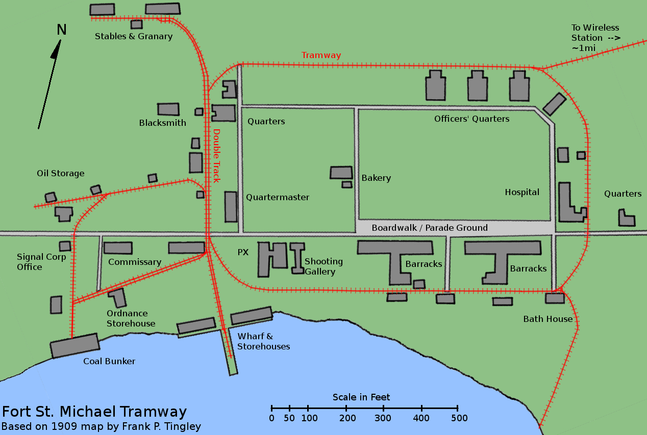 Established in 1911, the Navy radio station on Woody Island (near Kodiak) had a small push-tramway for freight. This was similar to other radio stations established in the same time period. This would have been the 2nd tramway on Woody Island, after the Russian ice tram from the 1850s.