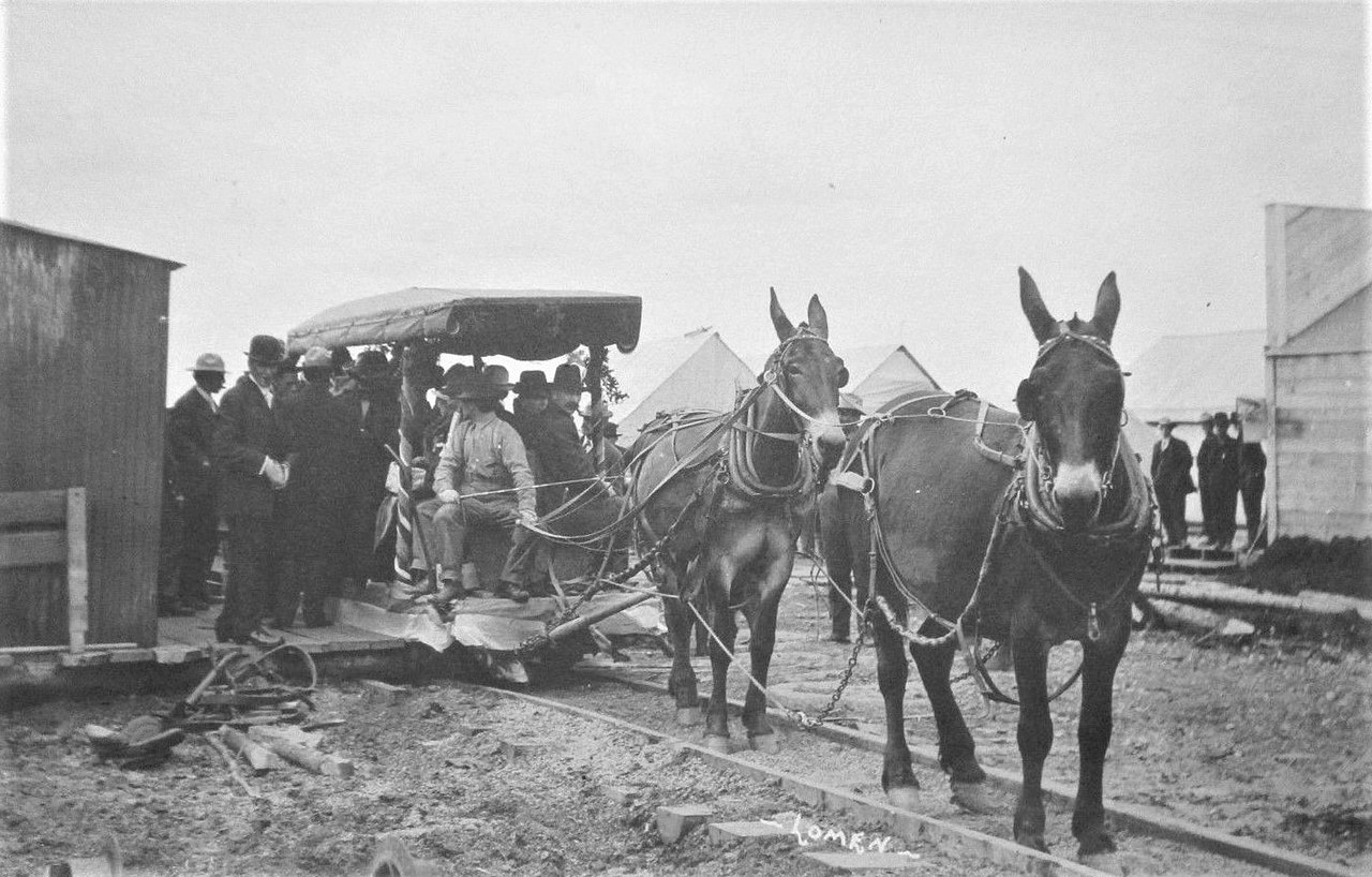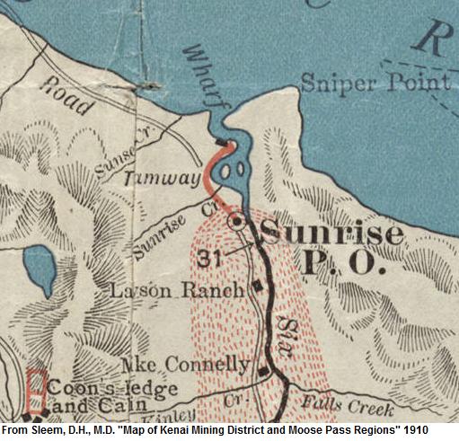 A horse-drawn railway or tramway apparently ran between the Diamond J and Diamond X canneries in Bristol Bay, a distance of about 3-4 miles. Several nearby canneries also had small railways to deal with shifting river courses and sandbars, but this would have been one of the longest in the area. Topo maps from the 1950s show a railroad symbol at the Coffee Creek cannery, along the road to Kvichak, which may have been the original tram route.