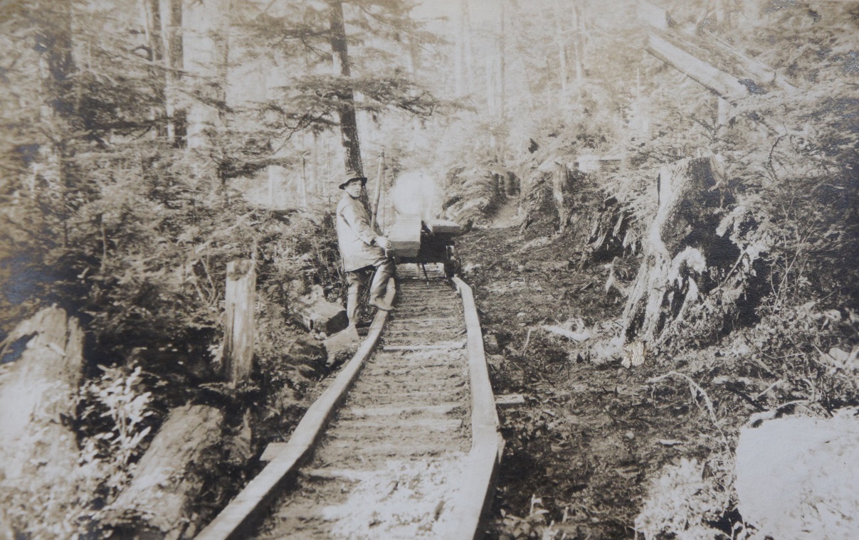 Tramway in woods at or near pulp mill, Courtesy of Alaska State Library, Eugene Patrick Kennedy Photograph Collection, P444-063.