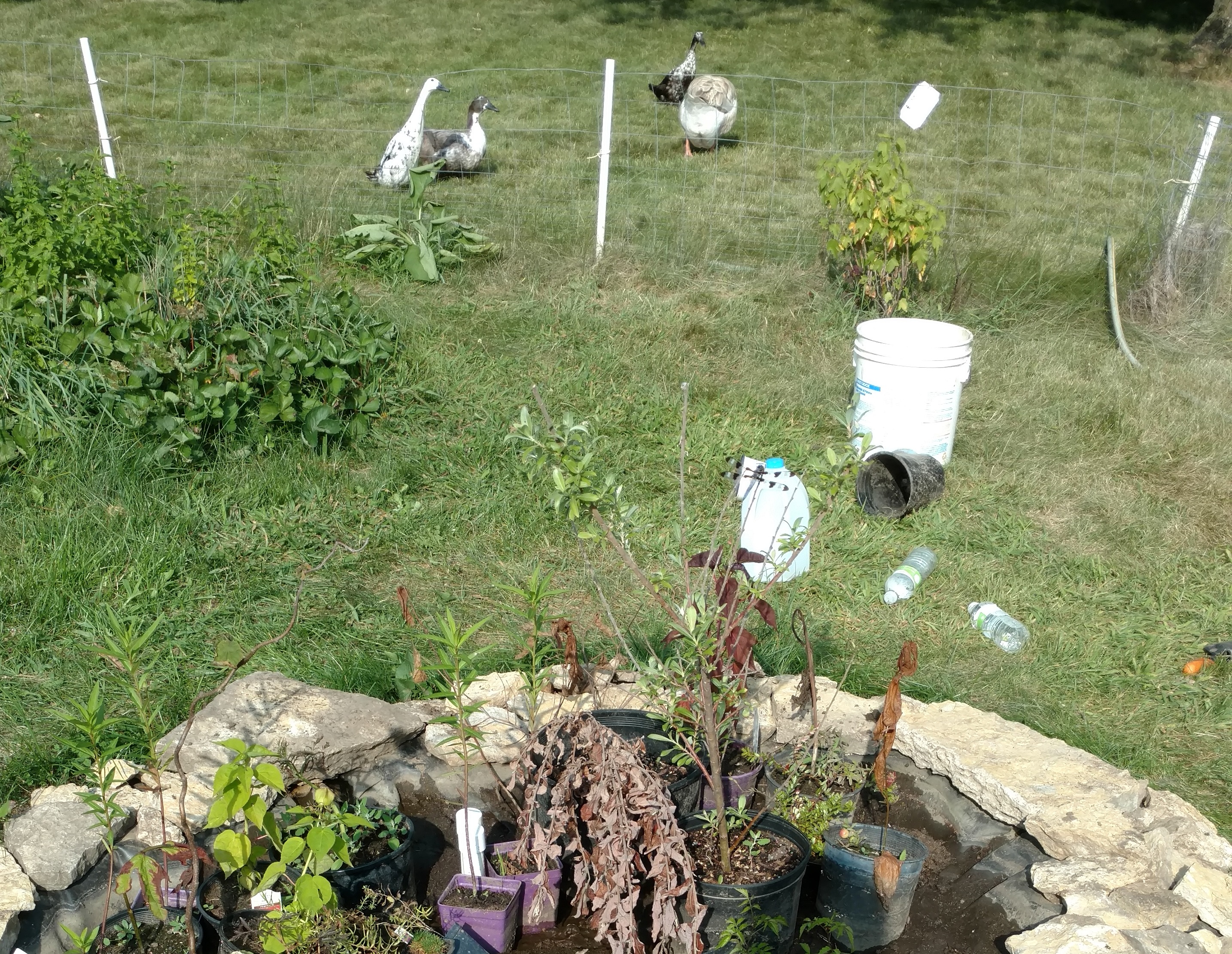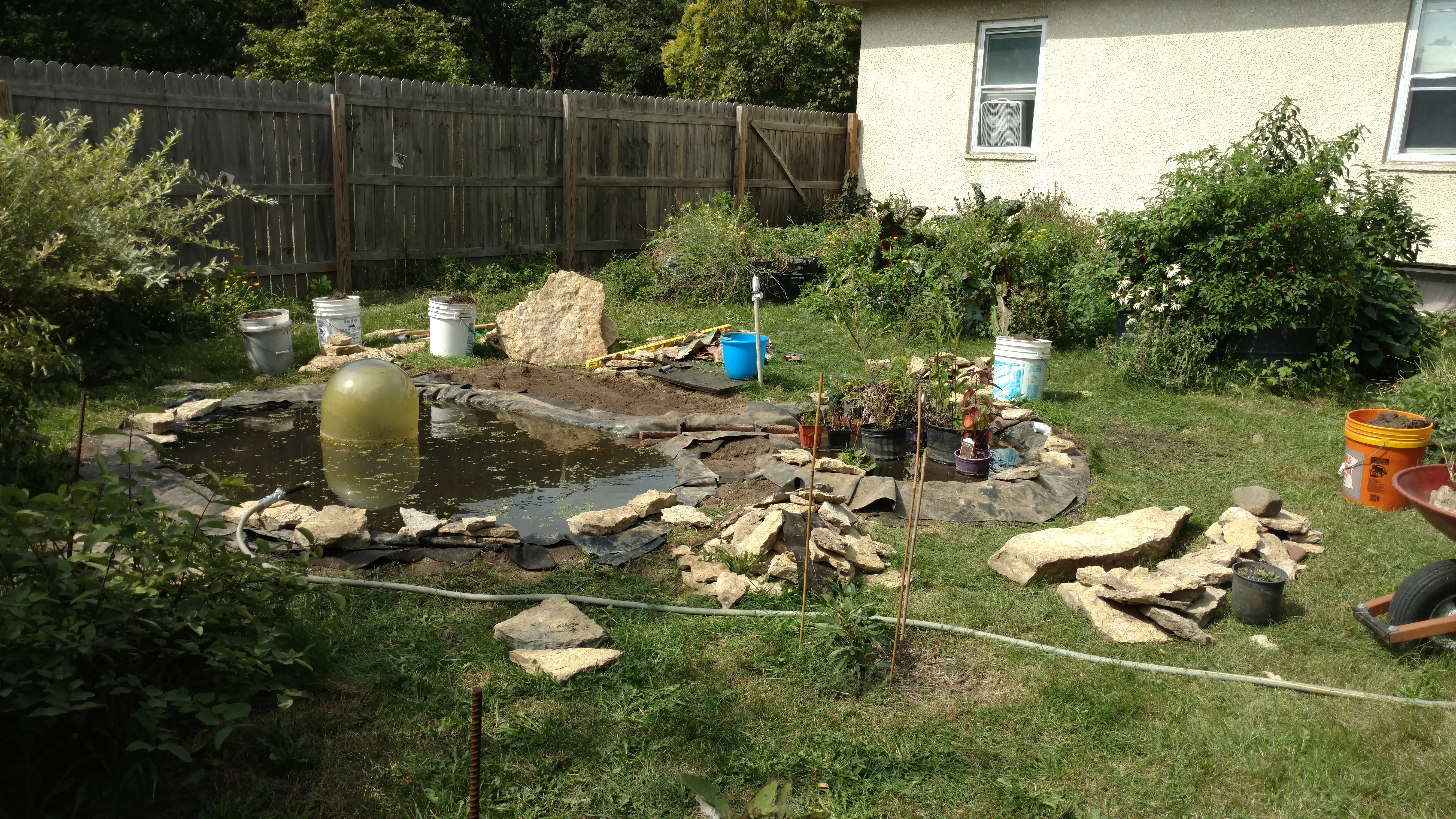 Another update is that the pond seems to have all major leaks taken care of. Previously I had an intermittent leak that would come and go, which made locating it very frustrating. After reading about the possibility of wicking/siphoning around folds in the liner, I added sealant to all the major folds. This seems to have done the trick, as the water level is much more stable! I’ve also adjusted the edge a bit more to try and divert overflows to a specific side, and to make rock edging easier. Next up is re-laying all the flat limestone rock around the perimeter!