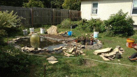 The pond is about 40″ deep when full. According to various books and websites, this *should* be sufficient for hardy fish like koi and goldfish to overwinter. We will likely add a heater and/or aerator to maintain a hole in the ice. We’ve put various artificial caves near the bottom so smaller fish can hide out and (hopefully) avoid getting eaten.