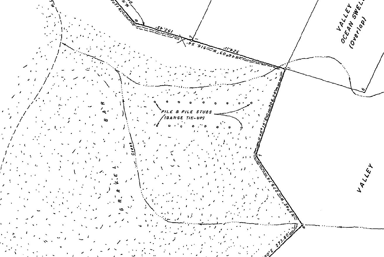 A barge tie-up on the tidal gravel bar at the mouths of Ottesen Creek and Dano Creek. (I previously had this listed as part of a cannery fish trap, but further review of the position, and the tidal location, leads me to believe it was related to the mine):