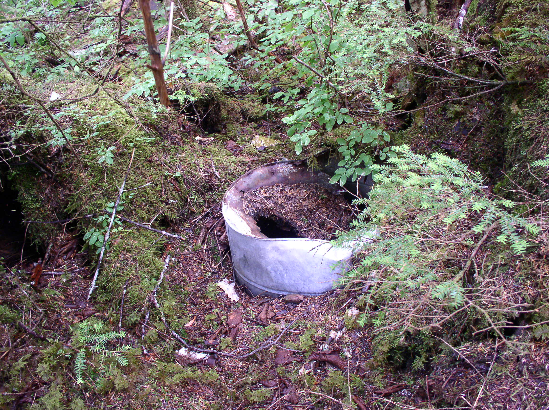 The Alaska Dano / Nowell-Otteson mine included workings in several locations. Original claims and development occurred near the sandy beach at the South shore of Funter Bay. Later, the claims extended in a long swath to the SE, and included a longer tunnel high on the side of Mount Robert Barron (the apparent goal being to follow a “ledge” or vein, of quartz from its outcrop near the beach to a hoped-for “mother lode” in the mountain). The company built a corduroy road through the swampy muskeg from their beach camp to the base of the mountain, and trails to the various mine workings. They do not appear to have had much mechanization beyond ore carts, some small stationary steam engines, and the tractor for the road. There were no major aerial trams or railroads (It’s possible that there was more equipment which was salvaged when mining wound down). The Dano mine later logged an area of old growth forest near the end of their road, leaving a clearcut which is still visible in infrared aerial photos.