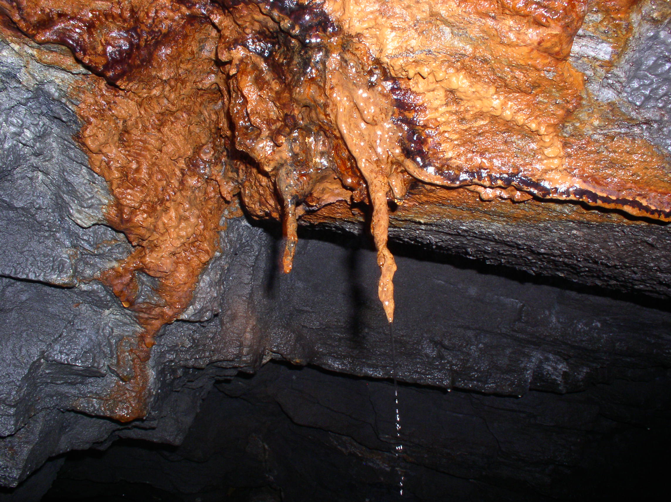 Iron leeching from a metal ore vein with water pouring off an iron stalactite: