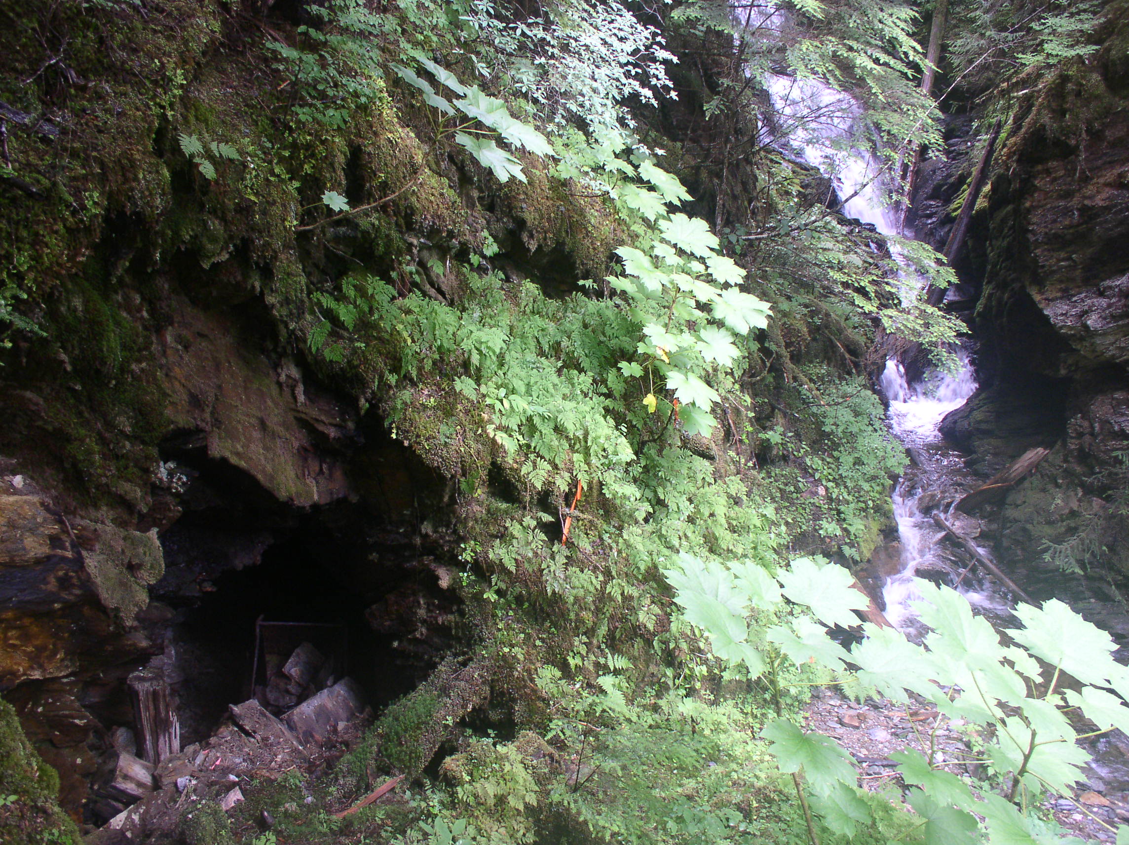 The main adit, was located closer to the base of the mountain, next to a small waterfall on Dano Creek. The corduroy road up to this mine is marked on various topo maps as a trail, a tractor trail, or a road. Likely the mine used a gas crawler tractor to haul supplies and equipment up to the adit from the beach.