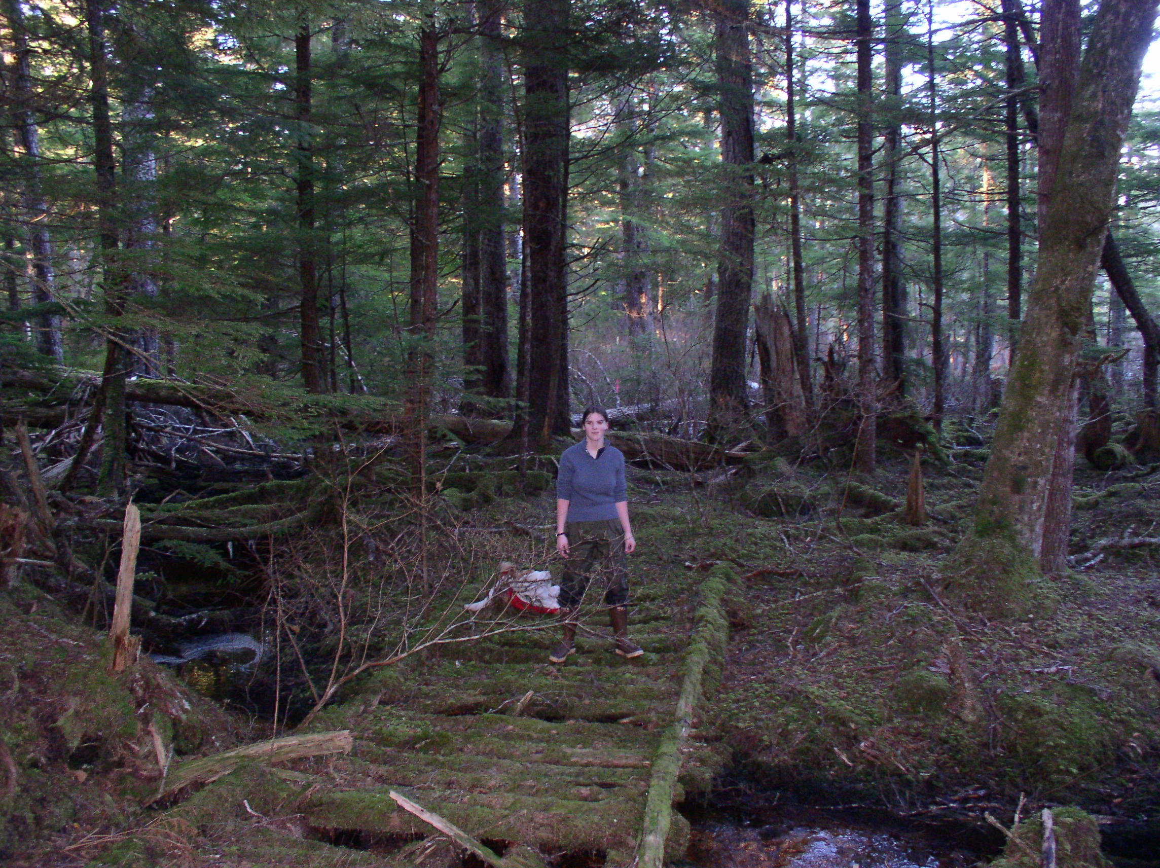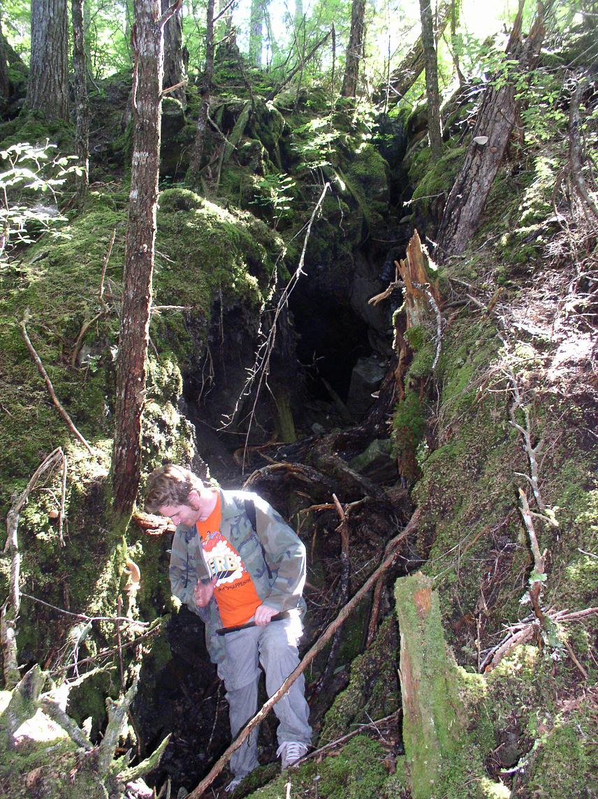 The mine adit (tunnel entrance) is immediately adjacent to Dano Creek. Mines in Southeast tend to be damp due to the high humidity and prevalent groundwater, but there is likely even more flow into this tunnel due to the stream. This has probably contributed to some of the collapse near the entrance.