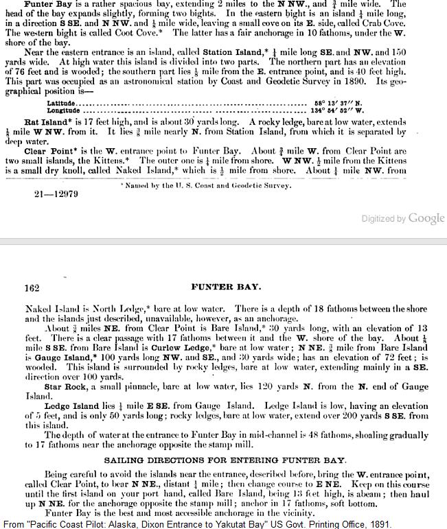 Also in 1911, the sailing steamship State of California went aground for four hours at Funter Bay, probably due to a misreading of the tide tables.