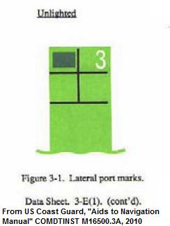 Modern charts describe the Clear Point light as green with a 2.5 second period, 16ft above mean sea level on a platform marked “1”. The Naked Island light is noted as being 44′ above sea level with a 6-second period, not numbered. The Green Can is marked with a number “3”. The original Black Can was in almost the same location and was first marked “2”, and is shown on later charts marked “1” No marker numbered “2” is nearby presently.