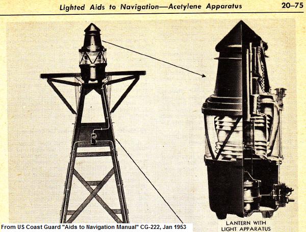 Both were originally listed as acetylene gas lights, some information on such lights can be found here. Devices invented early in the 20th century allowed gas lights to flash automatically at night and shut off during the day through use of a heat-operated “sun valve”. Early acetylene lights used calcium carbide with a water drip system to generate the gas, similar to a miner’s headlamp, as it was considered unsafe to compress acetylene. Later systems used compressed storage tanks after the technology had improved.