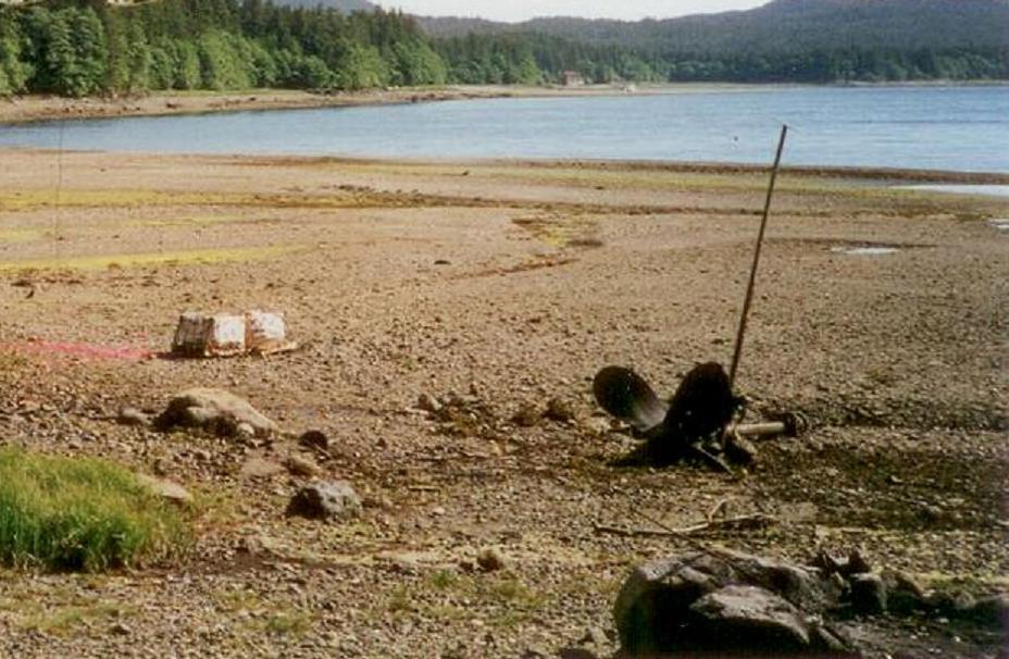 Piledriver hammer found underwater at Funter Bay and pulled out on shore. Note the slots on the side where the hammer would ride the vertical support rails: