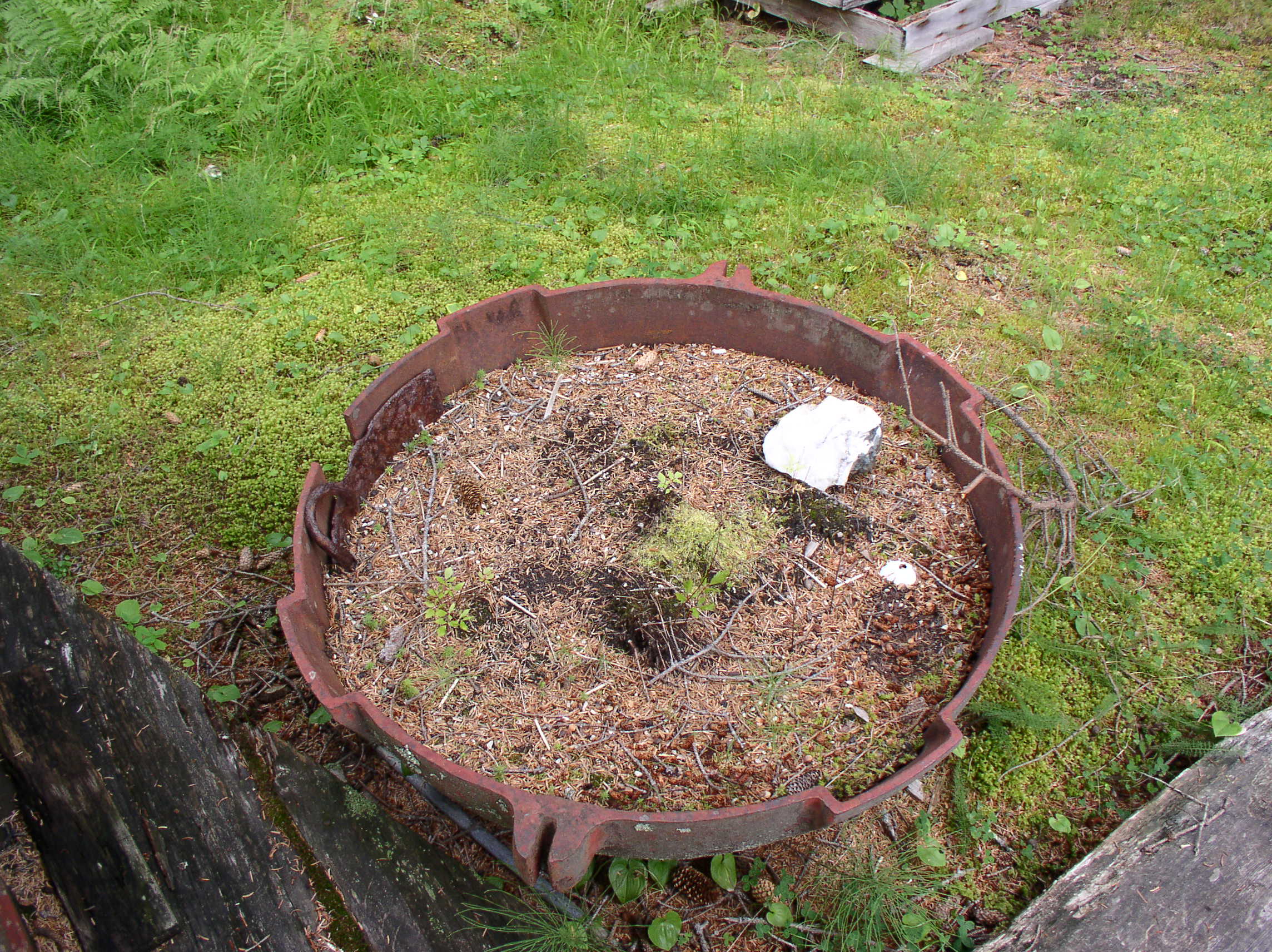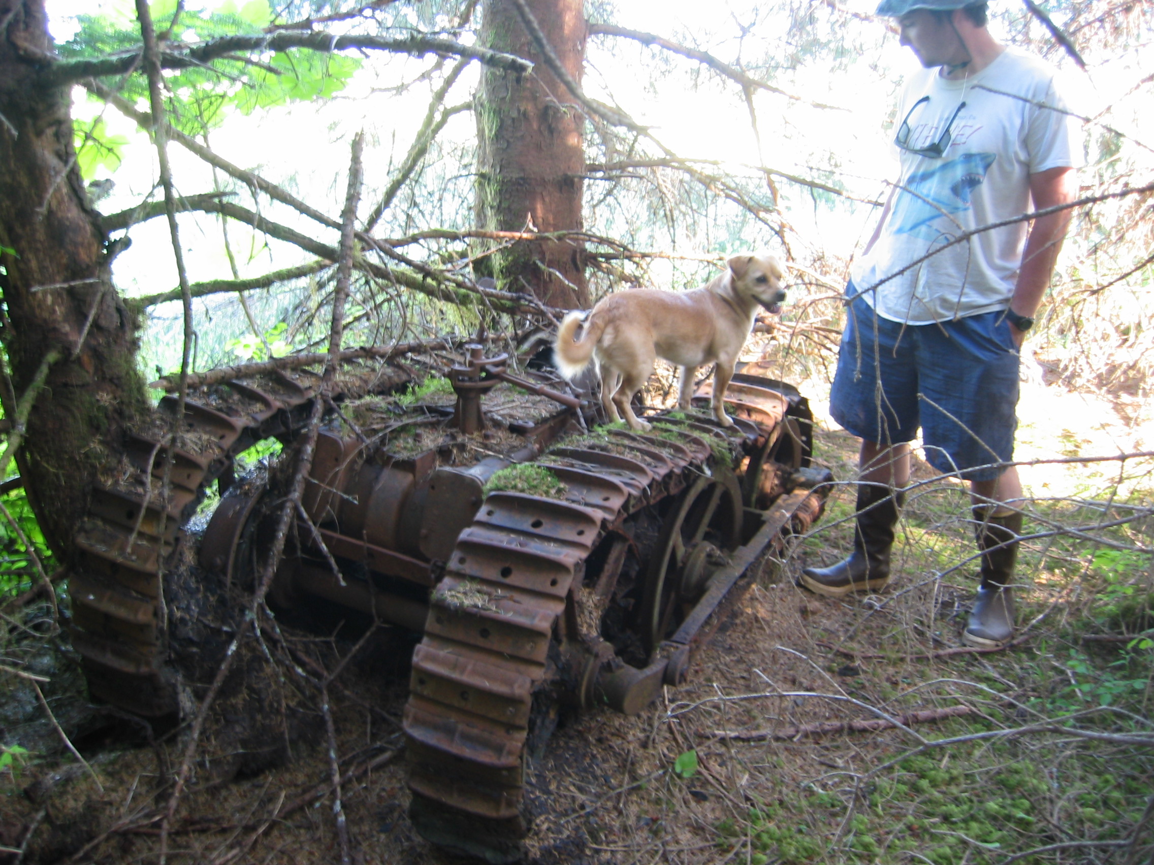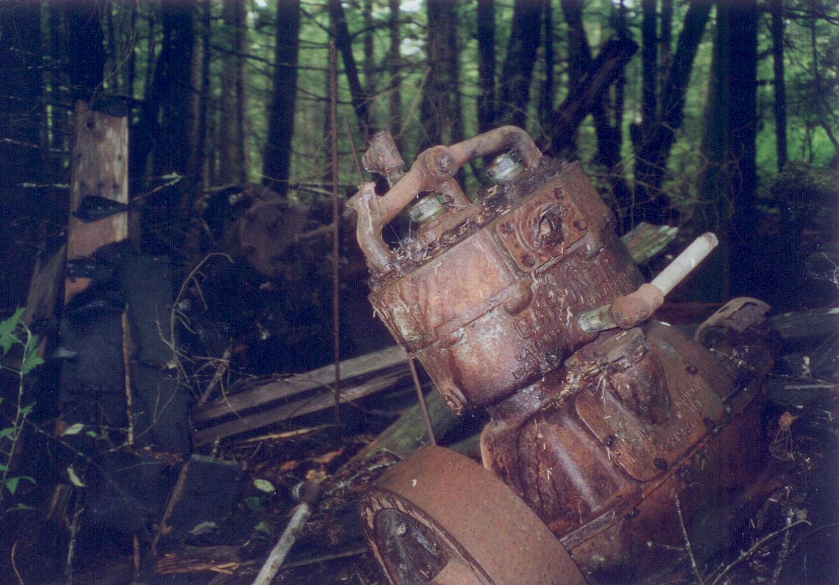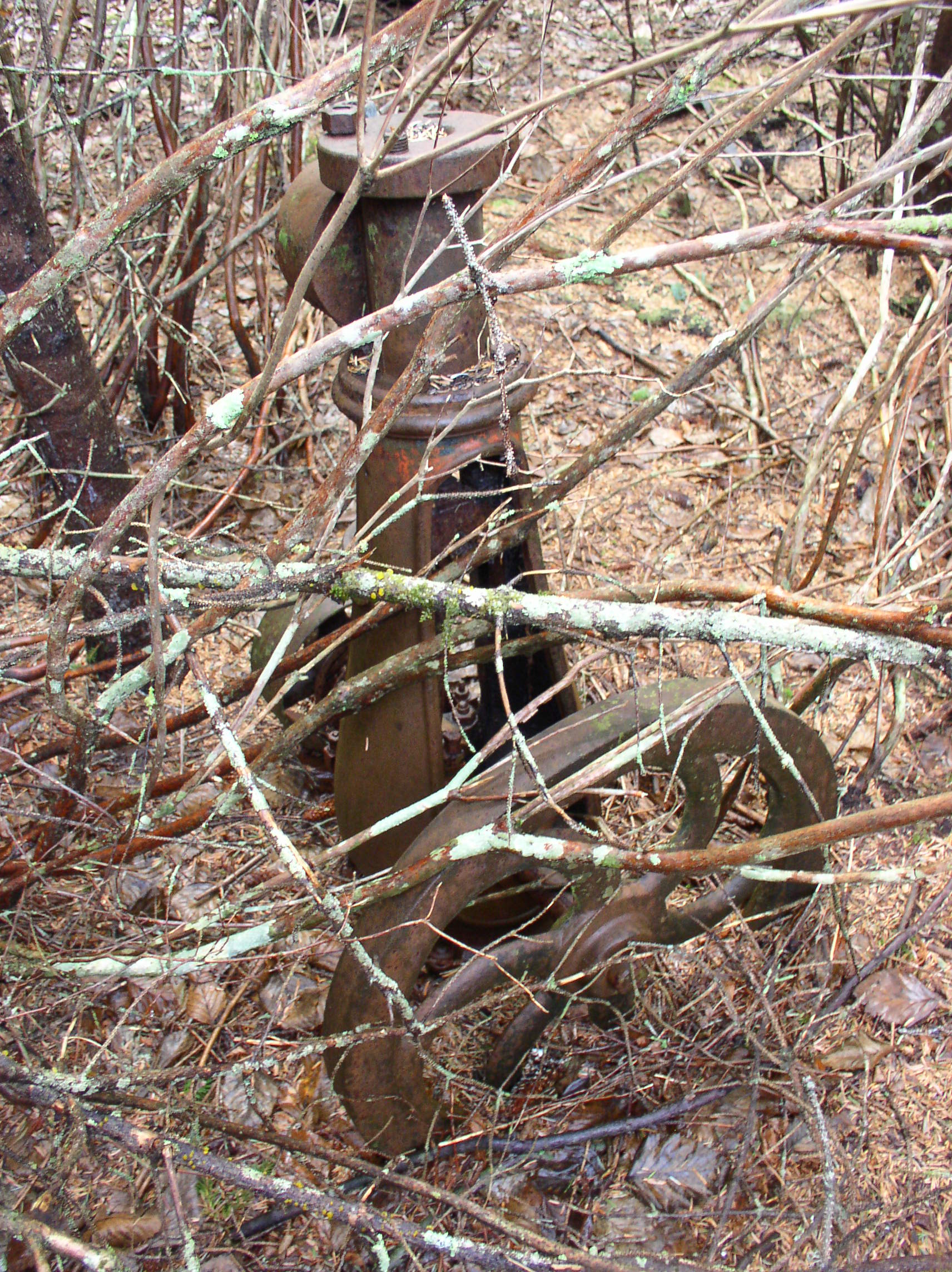 Neither photo shows the conical top or smokestack seen on other Vulcan donkeys, in the 1919 image they may have been removed for shipping, and by the time of my photos the stack seems to have rusted off and fallen to the ground (a few decades ago it was still mostly upright and covered with a washtub).