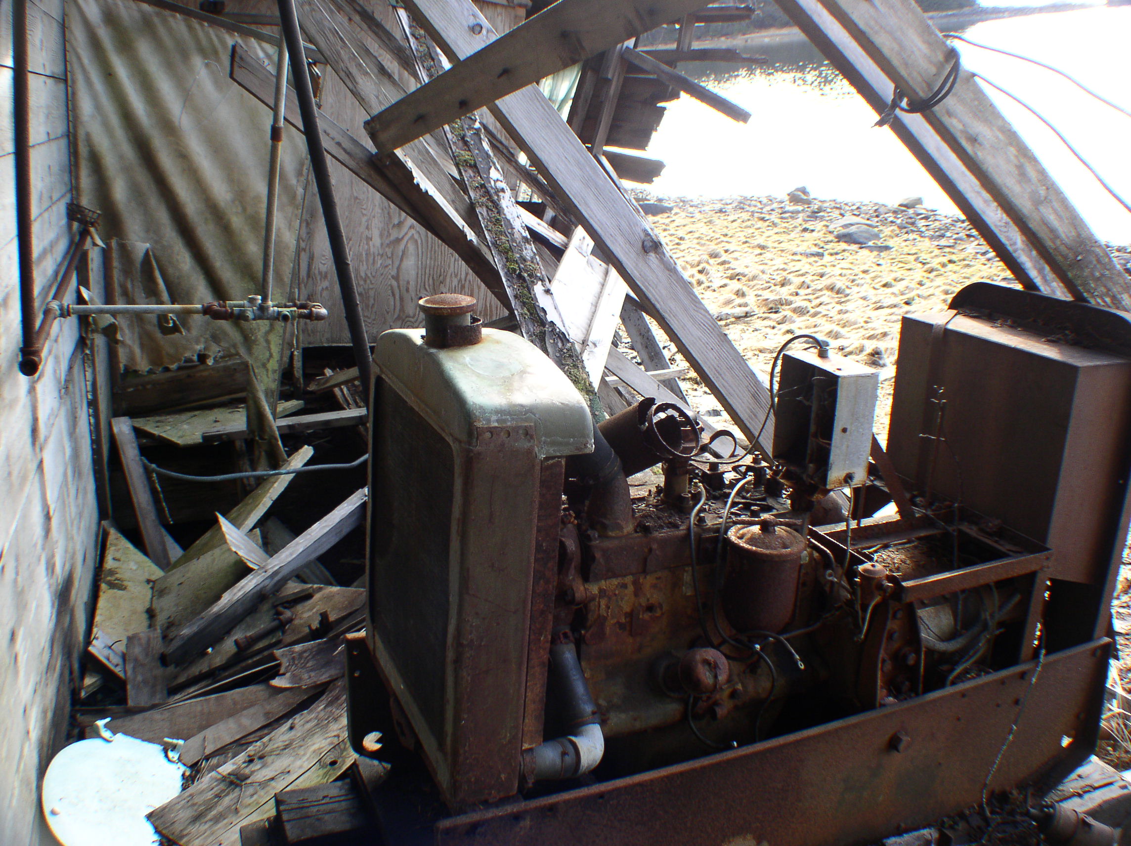 There are a number of old “Oil” engines (usually diesel or semi-diesel) around Funter Bay, and a few gasoline engines. Some of these started out supplying mechanical power, and were later converted to generators.  The smaller units had a tendency to disappear from their original locations, as they could be shoehorned into a fishing boat with some effort. As such, there are not as many left in-context, and while you can find them in use as lawn decor, or lying on the beach, or half-buried in the woods, it’s less clear where they originally came from.