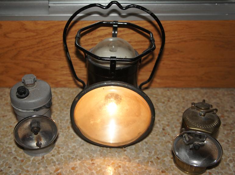 Portable lighting moved slowly from lanterns to battery flashlights. In local mines, carbide lamps remained popular into the 1970s. A mixture of portable lights are seen below, including an older brass carbide lamp, 1930s electric (battery) railway lantern found at Funter, and a 1970s carbide lamp:
