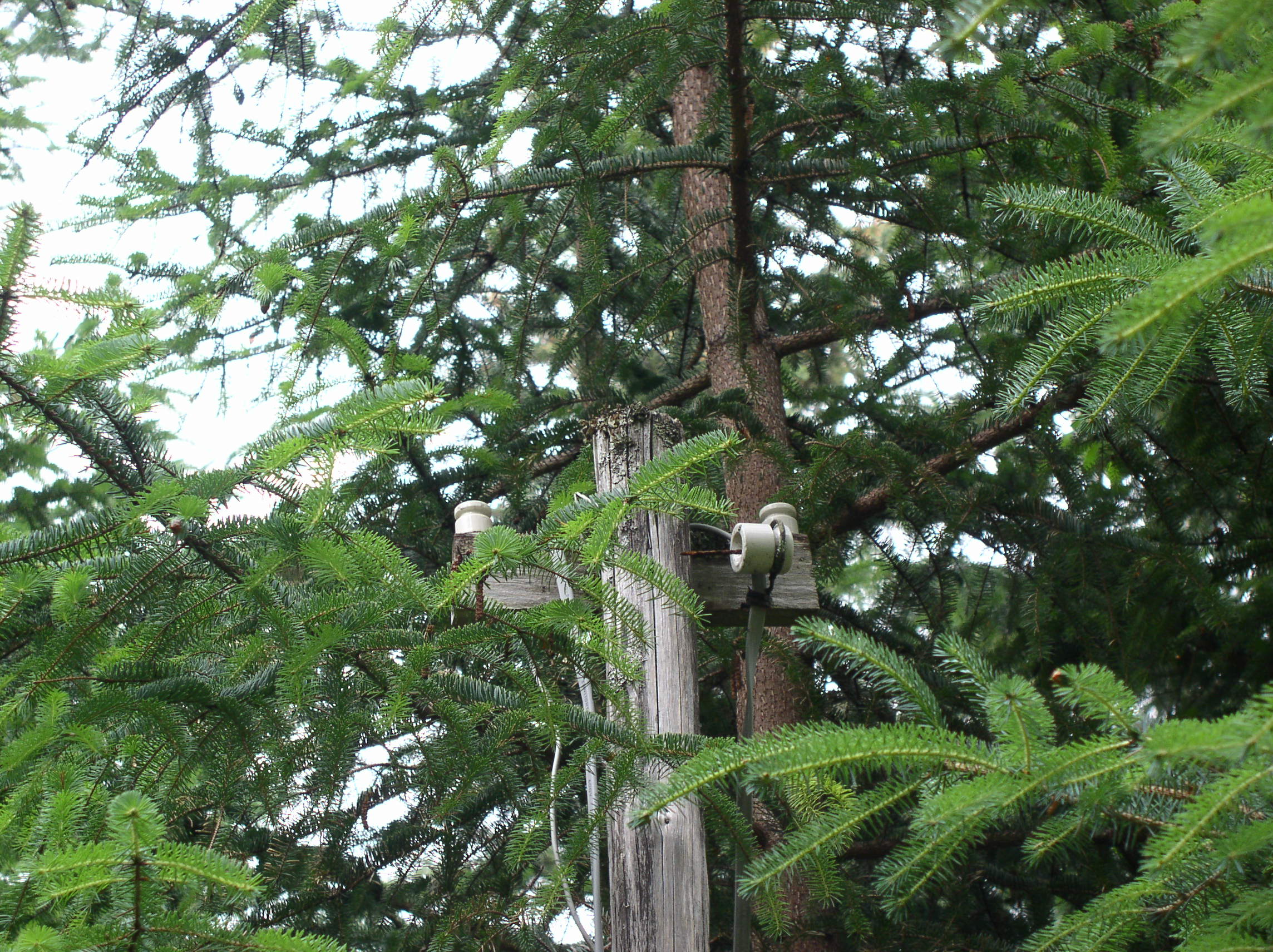 A utility pole at the cannery, with some smaller ceramic insulators. Most of these poles were simply untreated logs stuck in the ground, and many are now getting crowded out by trees.