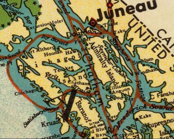 Alaska Steamship Co route map, 1936. Funter Bay is visible just to the SW of Juneau: