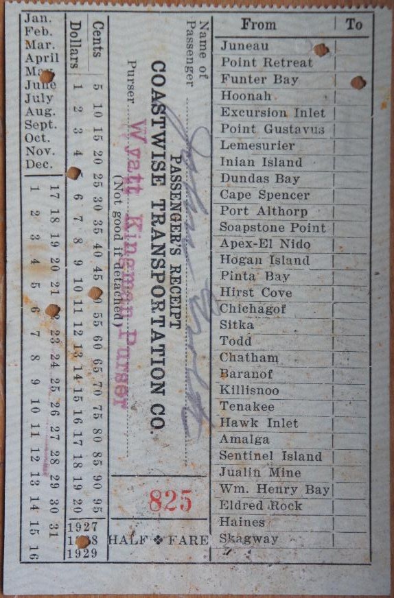 Below is a ticket stub from 1928. Funter Bay is listed as one of many possible destinations, including various small towns, lighthouses, canneries, fox farms, mines, etc. Fare in 1928 from Juneau to Funter was $5.50.
